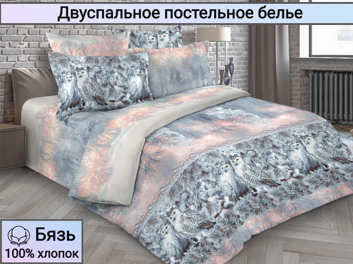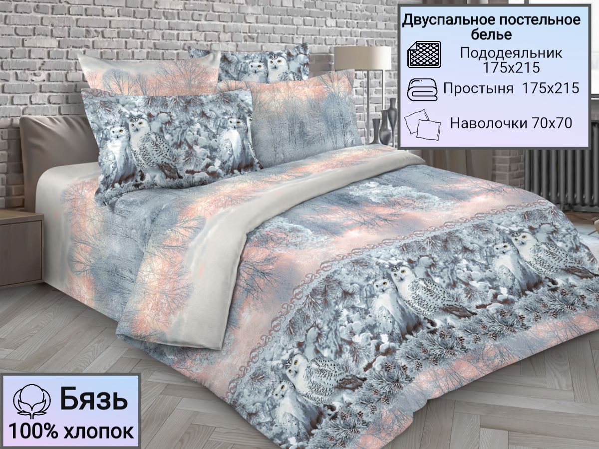 Комплект постельного белья из бязи с зимними совами дарит хорошее настроение с первых минут. Рисунок комплекта – яркий зимний пейзаж с заснеженными ветвями и совы, сидящие на них на фоне зари. Такая картина создает атмосферу уюта и тепла в доме, настраивает на ожидание нового года. Постельное белье «Совы зимой» изготовлено из 100% хлопка (ткань бязь, плотность 120 гр.) Натуральный хлопок не вызывает аллергии, гигроскопичен, хорошо пропускает воздух, позволяя телу дышать. Комплект состоит из пододеяльника размером 175х215, простыни размером 175х215 и 2 наволочек размером 70х70.