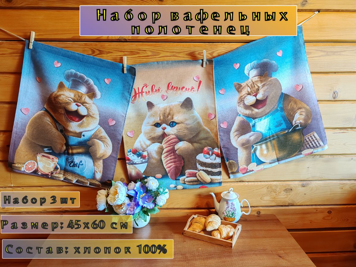 165 / синий / Кот Десантий / Кот, котёнок / 200 / Вафельное полотно / Набор полотенец для кухни, вафельное полотно, размер 45х60, 3 штуки в упаковке. / Ивановский текстиль / 45x60 / Прямоугольник / 3 / Вафельная / Универсальный