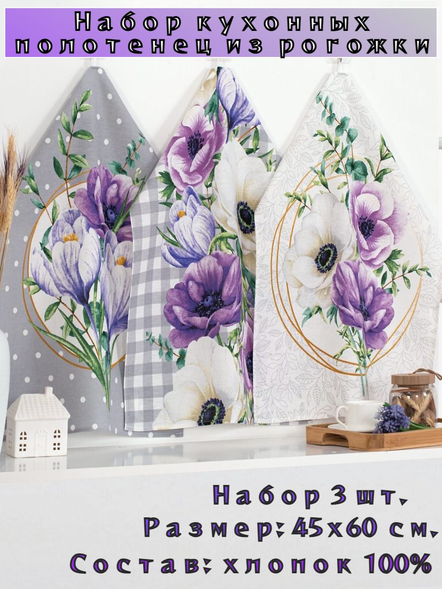 165 / фиолетовый / Анютины глазки / Цветы / 200 / Рогожка / Набор полотенец для кухни из рогожки, размер 45х60, 3 штуки в упаковке. / Ивановский текстиль / 45x60 / Прямоугольник / 3 / Рогожка / Универсальный