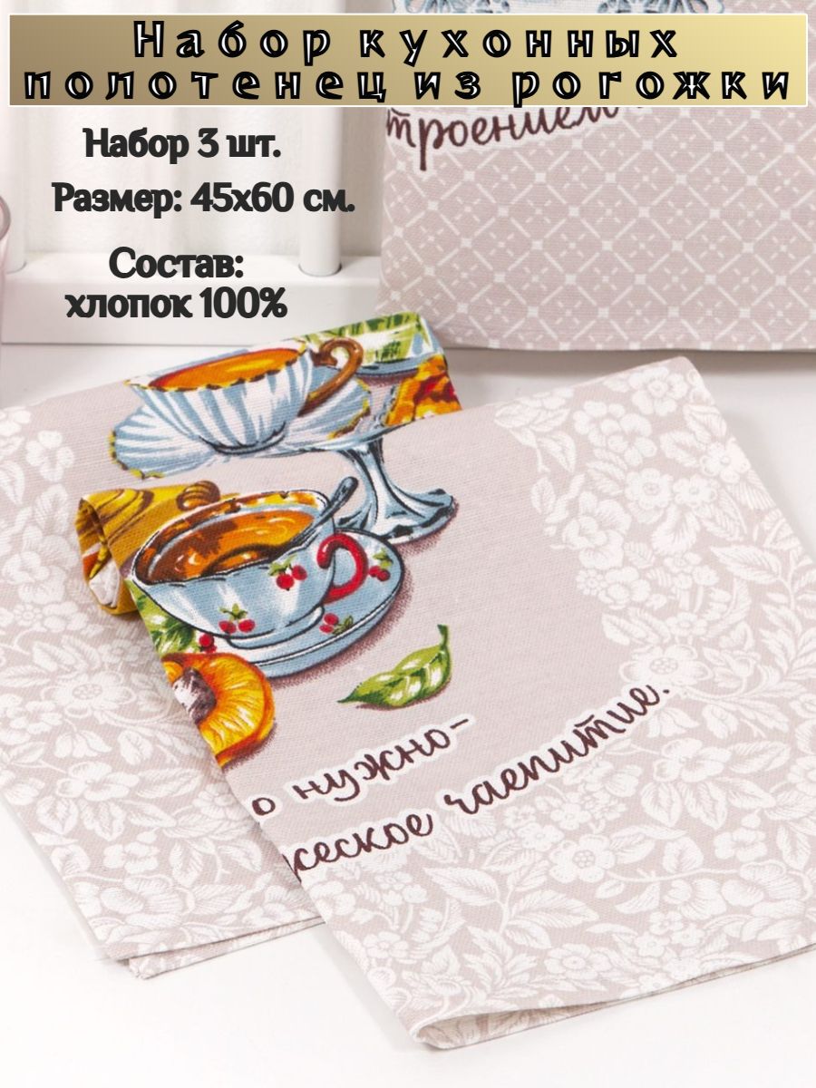 165 / белый / Дружеское чаепитие / Кухонная утварь / 200 / Рогожка / Набор полотенец для кухни из рогожки, размер 45х60, 3 штуки в упаковке. / Ивановский текстиль / 45x60 / Прямоугольник / 3 / Рогожка / Универсальный