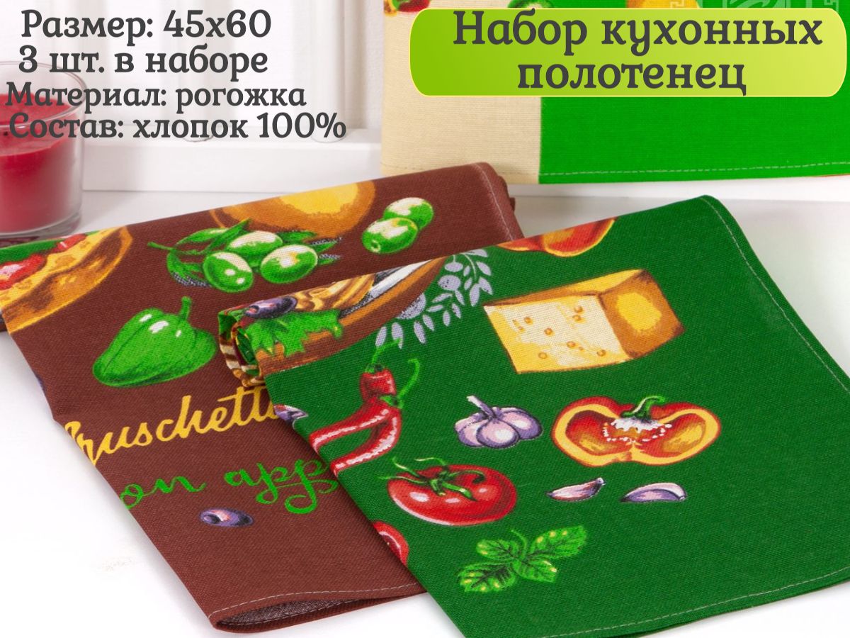 165 / зеленый / Итальяно / Еда и напитки / 200 / Рогожка / Набор полотенец для кухни из рогожки, размер 45х60, 3 штуки в упаковке. / Ивановский текстиль / 45x60 / Прямоугольник / 3 / Рогожка / Универсальный