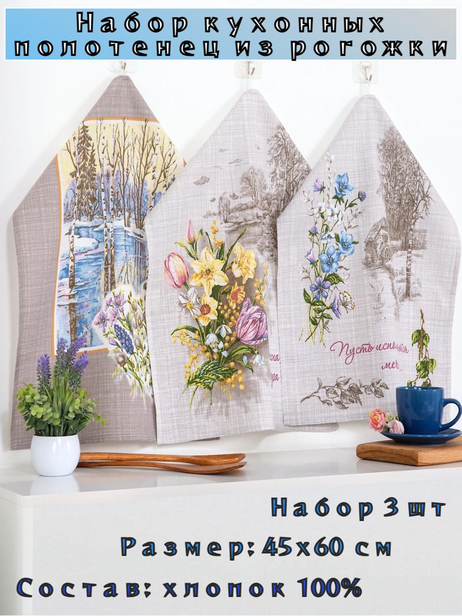 165 / белый / Весна / Растения / 200 / Рогожка / Набор полотенец для кухни из рогожки, размер 45х60, 3 штуки в упаковке. / Ивановский текстиль / 45x60 / Прямоугольник / 3 / Рогожка / Универсальный