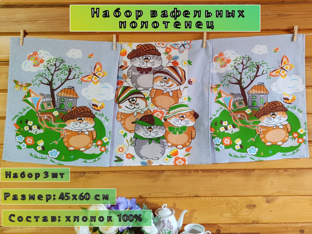 В комплекте 3 кухонных полотенца размером 45х60 прямоугольной формы. Полотенца изготовлены из вафельного полотна (100% хлопок), станут прекрасным подарком родным и близким на любой праздник. Яркий рисунок, праздничный дизайн понравится каждой хозяйке. Вафельное полотно – ткань широкого применения, мягко и деликатно убирает влагу с хрусталя, не оставляет царапин и разводов. Полотенца создадут атмосферу праздника, станут незаменимыми помощниками на кухне, так прекрасно впитывают влагу, помогают убирать загрязненные поверхности, быстро сохнут. Комплект кухонных полотенец упакован в прозрачный пакет.