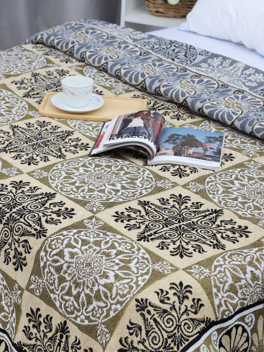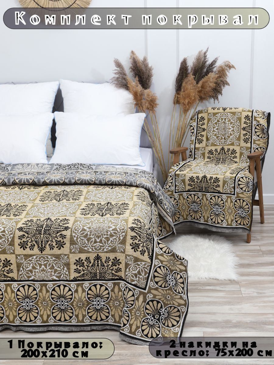 Комплект из 3 изделий - 1 тканое покрывало размером 200х210 см. и 2 покрывала на кресла размером 75х200 см. в одной цветовой гамме. Покрывало универсально - оно подходит как на диван, так и на кровать и предназначено, прежде всего, для защиты поверхности диванов и кресел от загрязнений , пыли , шерсти животных, и различных механических повреждений и быстрого износа. Ковровые тканые дивандеки выполнены из качественного полотна, плотностью 310 гр/кв.м. Комплект покрывал произведен в России, г. Иваново. За изделиями легко ухаживать, рекомендуется стирать вручную или применять машинную стирку при 30 градусах.