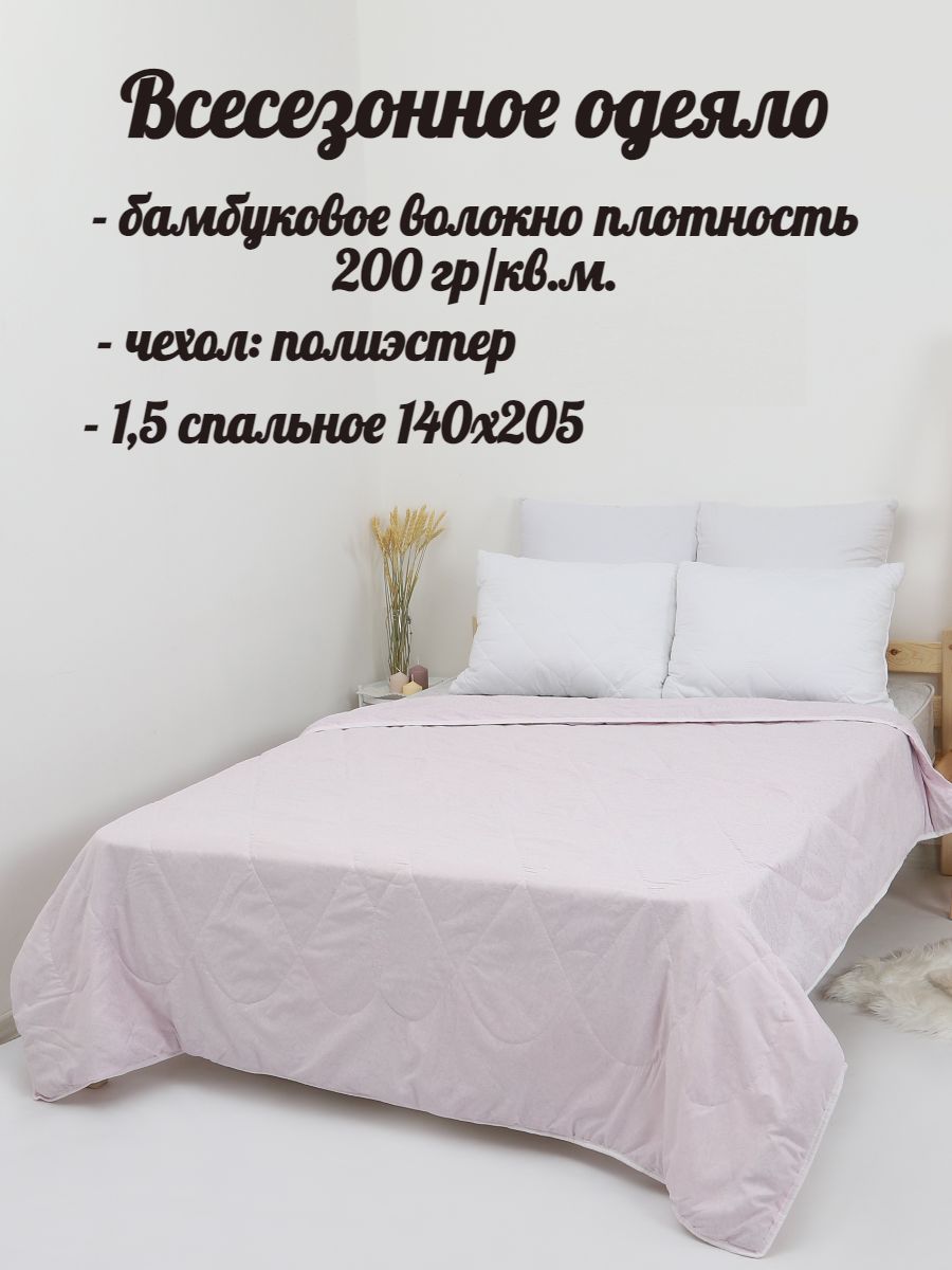 Одеяло с наполнителем из бамбукового волокна плотностью 200 грамм на квадратный метр обладает естественными антибактериальными свойствами, не вызывает аллергии, позволяет воздуху свободно циркулировать, а так же регулирует температуру в зависимости от окружающей среды. Чехол из полиэстера отличается мягкостью и доступностью по цене. Размеры одеяла – полутороспальное 140 х 205 см. Бамбуковое одеяло подойдёт как подарок на 23февраля, 8 марта или Новый год.
