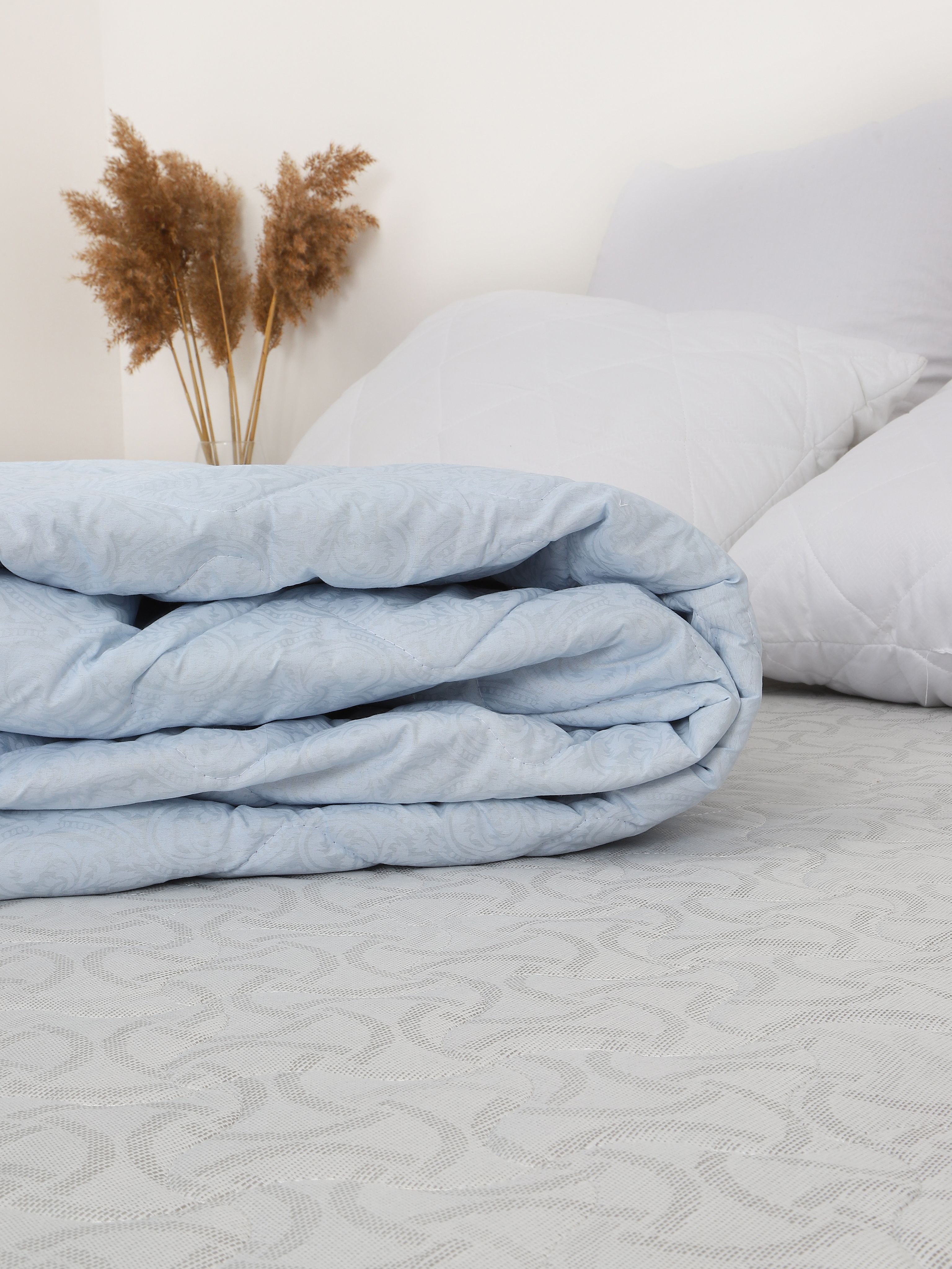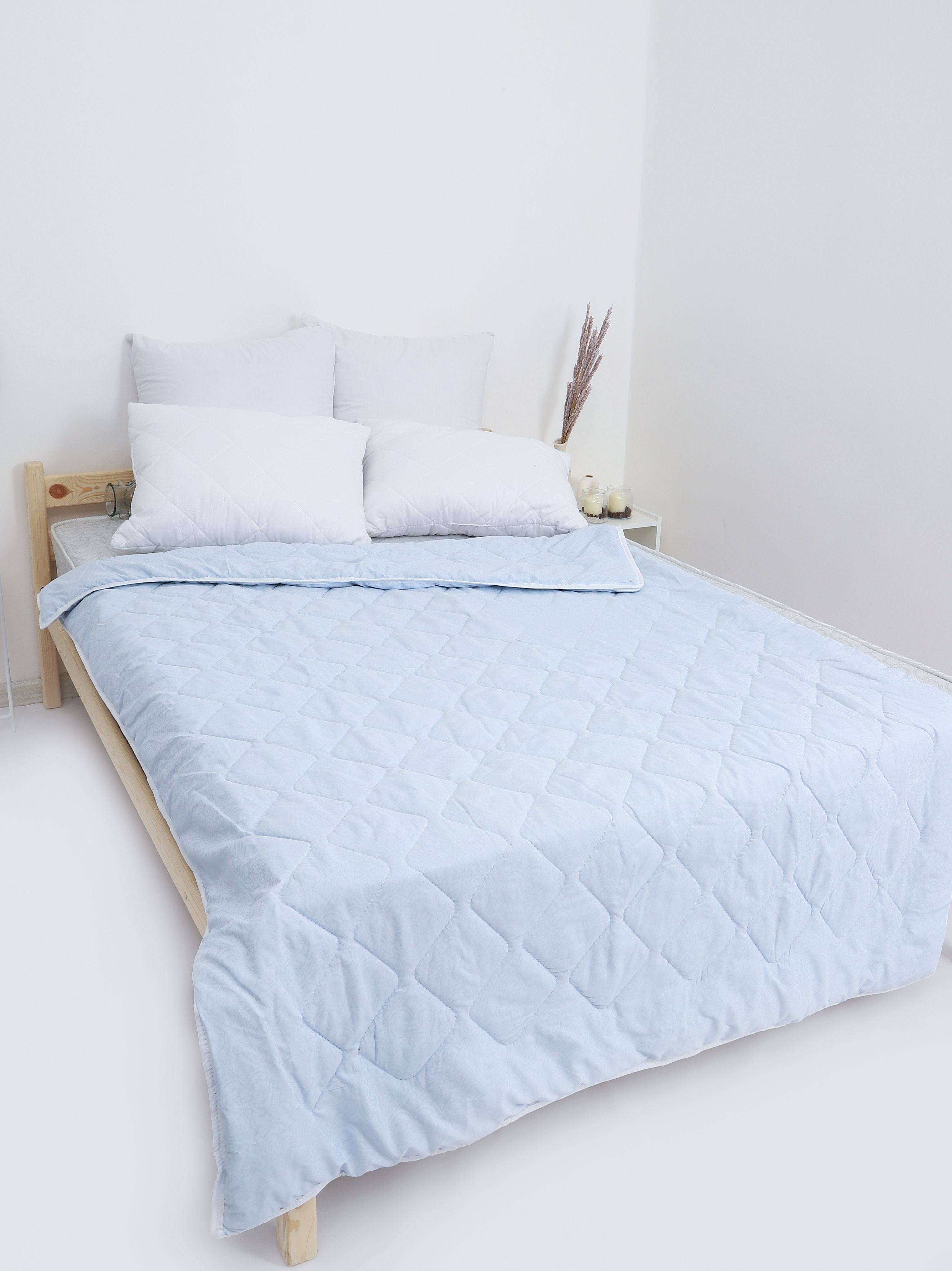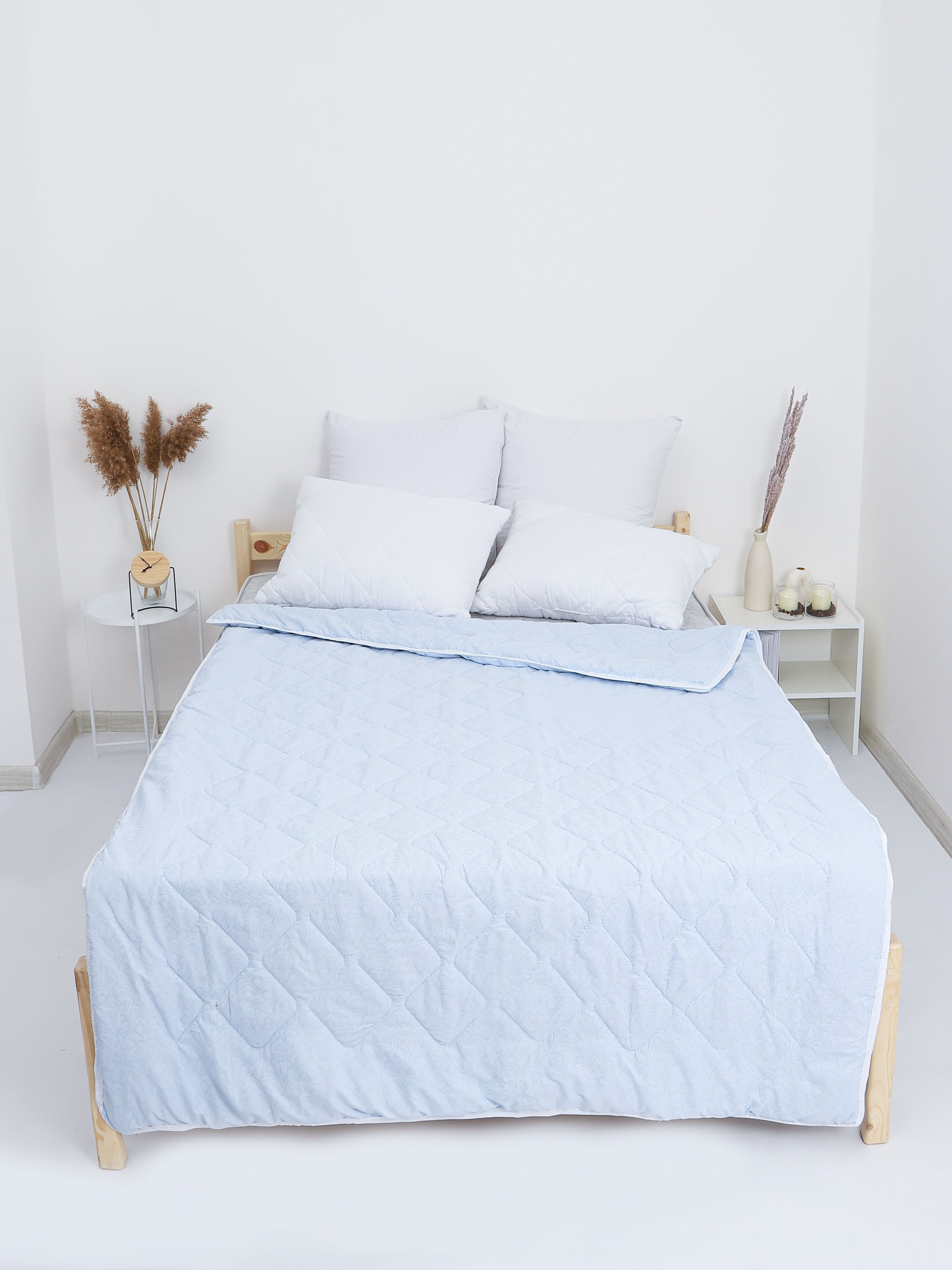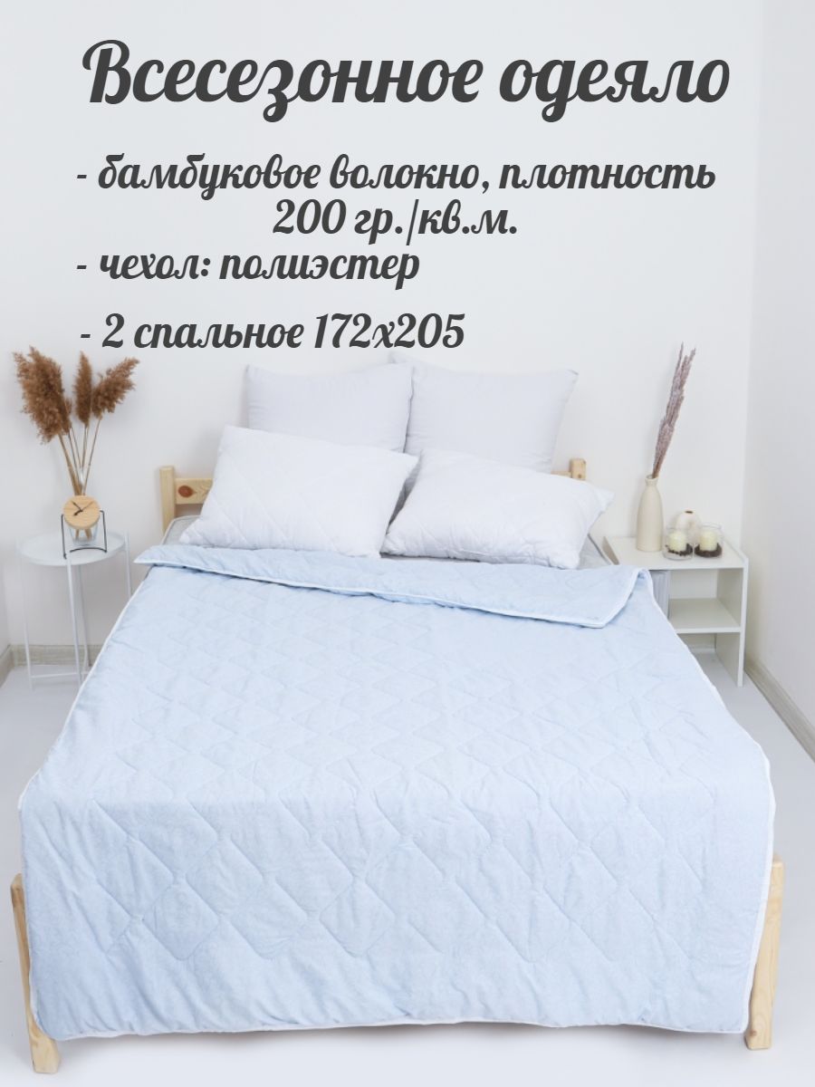 Одеяло с наполнителем из бамбукового волокна плотностью 200 грамм на квадратный метр обладает естественными антибактериальными свойствами, не вызывает аллергии, позволяет воздуху свободно циркулировать, а так же регулирует температуру в зависимости от окружающей среды. Чехол из полиэстера отличается мягкостью и доступностью по цене. Размеры одеяла – двуспальное 172 х 205 см. Бамбуковое одеяло подойдёт как подарок на 23февраля, 8 марта или Новый год