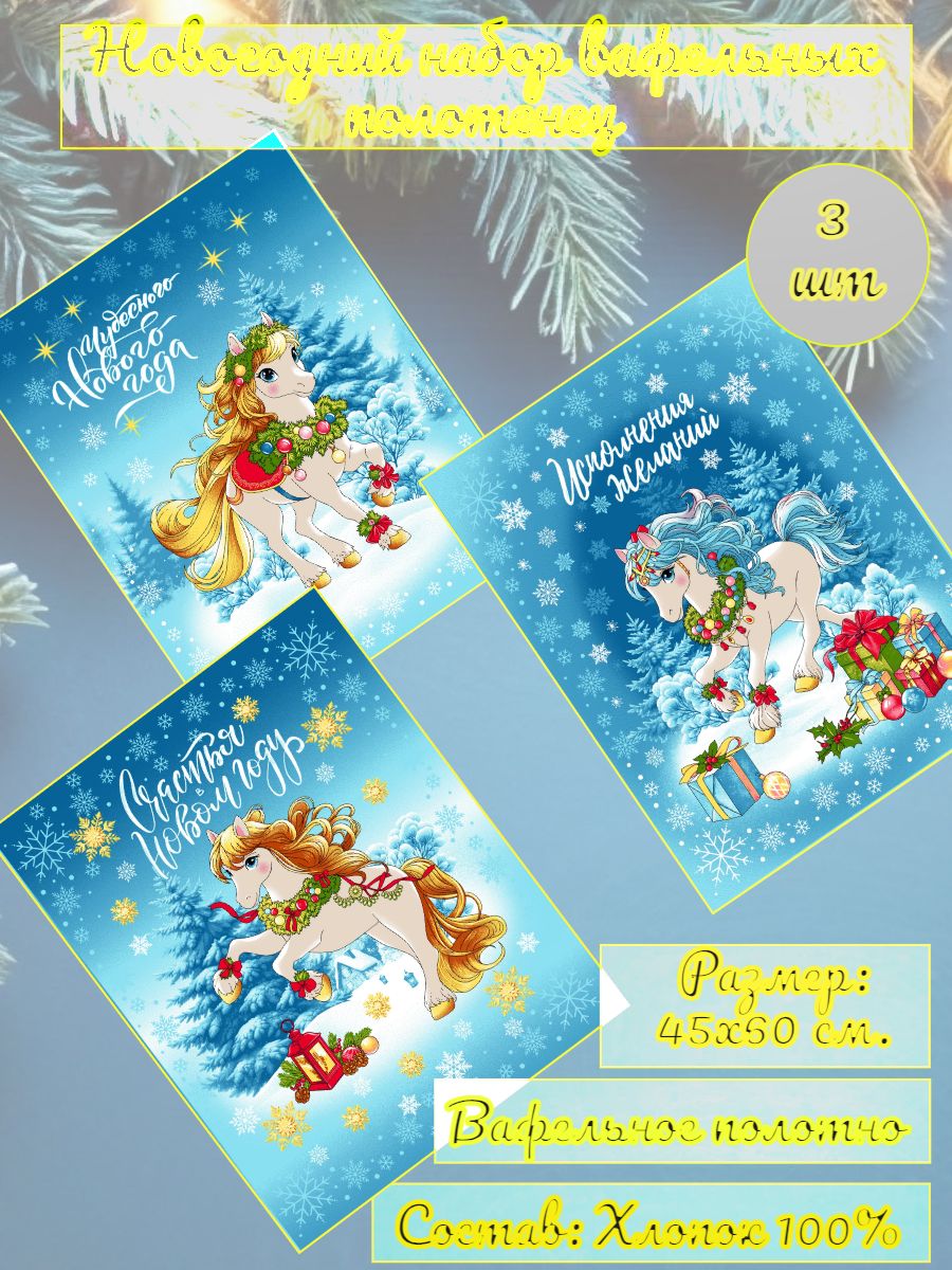 В комплекте 3 кухонных полотенца размером 45х60 прямоугольной формы. Полотенца изготовлены из вафельного полотна (100% хлопок), станут прекрасным подарком родным и близким на Новый год, яркий рисунок, праздничный дизайн понравится каждой хозяйке. Вафельное полотно – ткань широкого применения, мягко и деликатно убирает влагу с хрусталя, не оставляет царапин и разводов. Полотенца создадут атмосферу праздника, станут незаменимыми помощниками на кухне, так прекрасно впитывают влагу, помогают убирать загрязненные поверхности, быстро сохнут. Комплект кухонных новогодних полотенец упакован в прозрачный пакет.