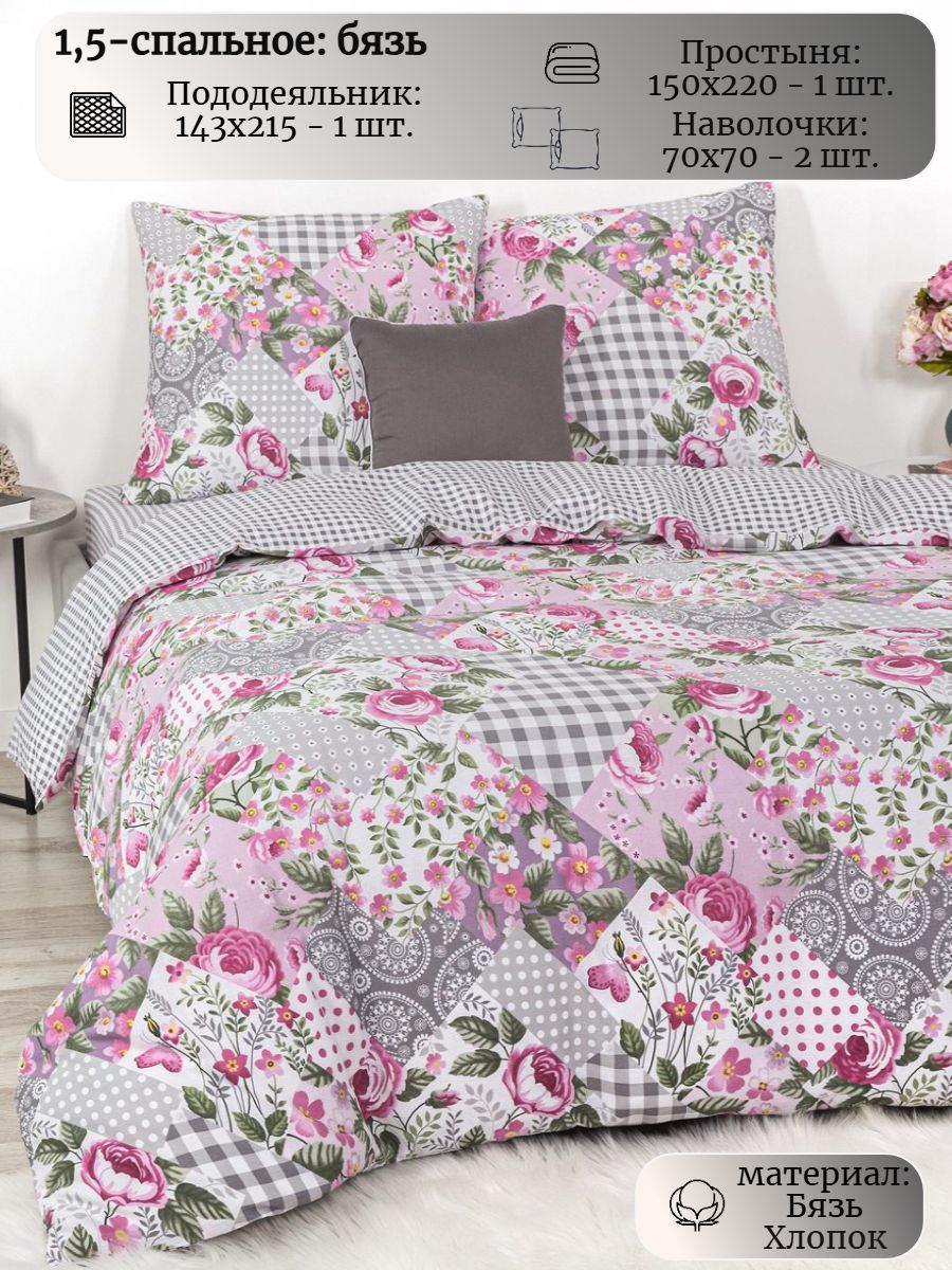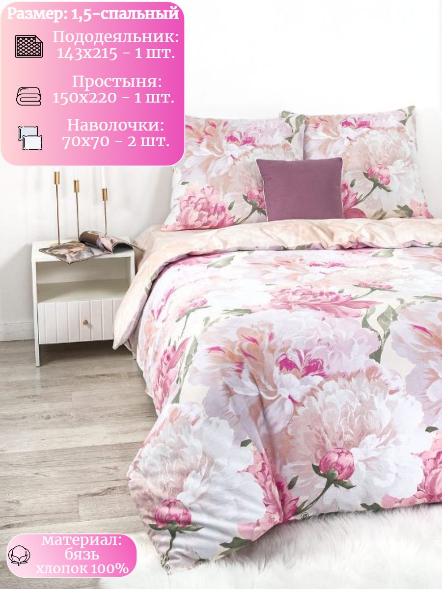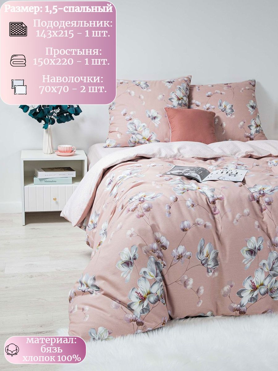 120 / розовый / Модистка / Цветы / 1250 / Ивановский текстиль / Полуторный / 143x215 / 1 пододеяльник, 1 простыня, 2 наволочки / 150x220 / Средняя / Унисекс / 4