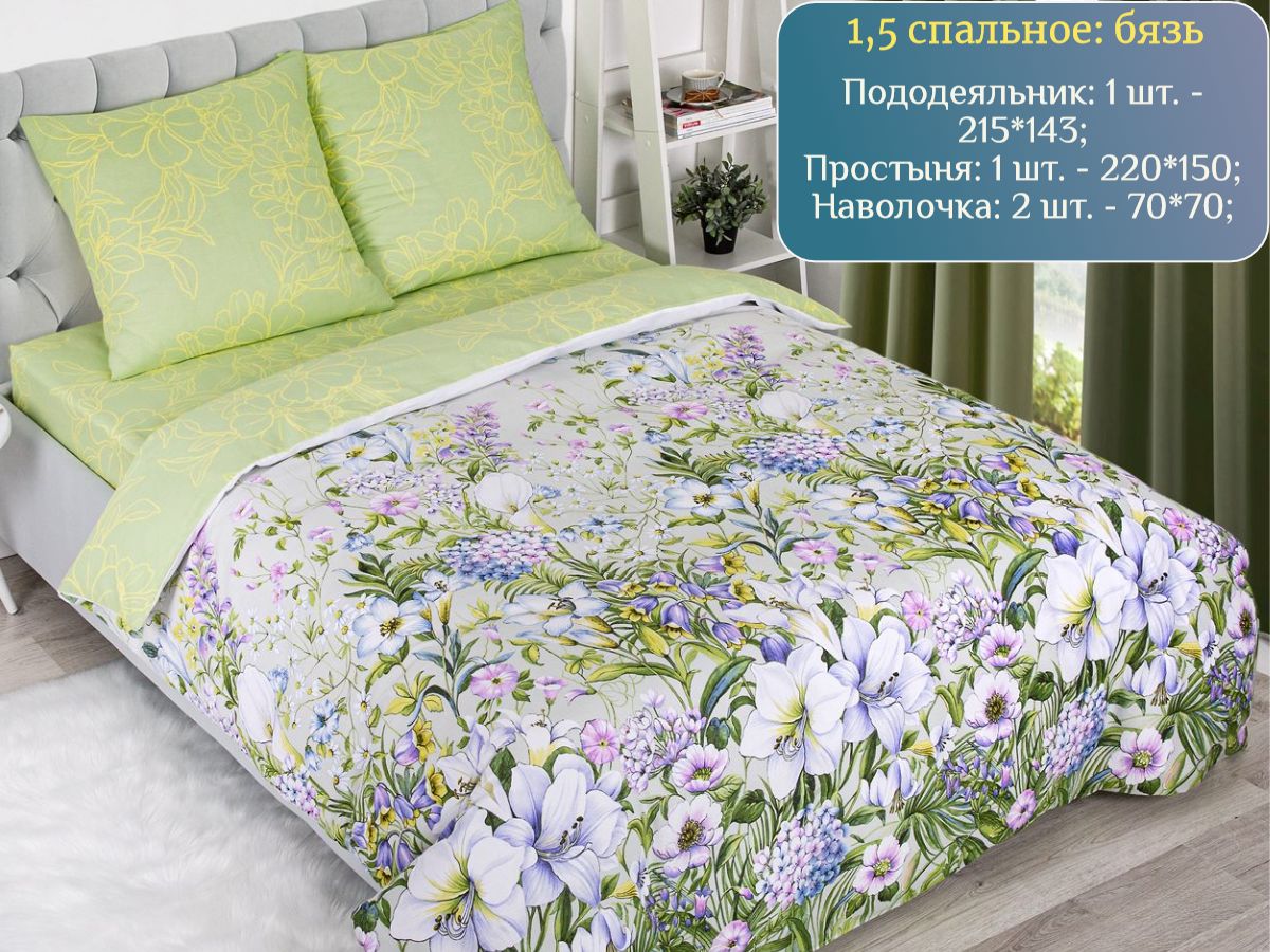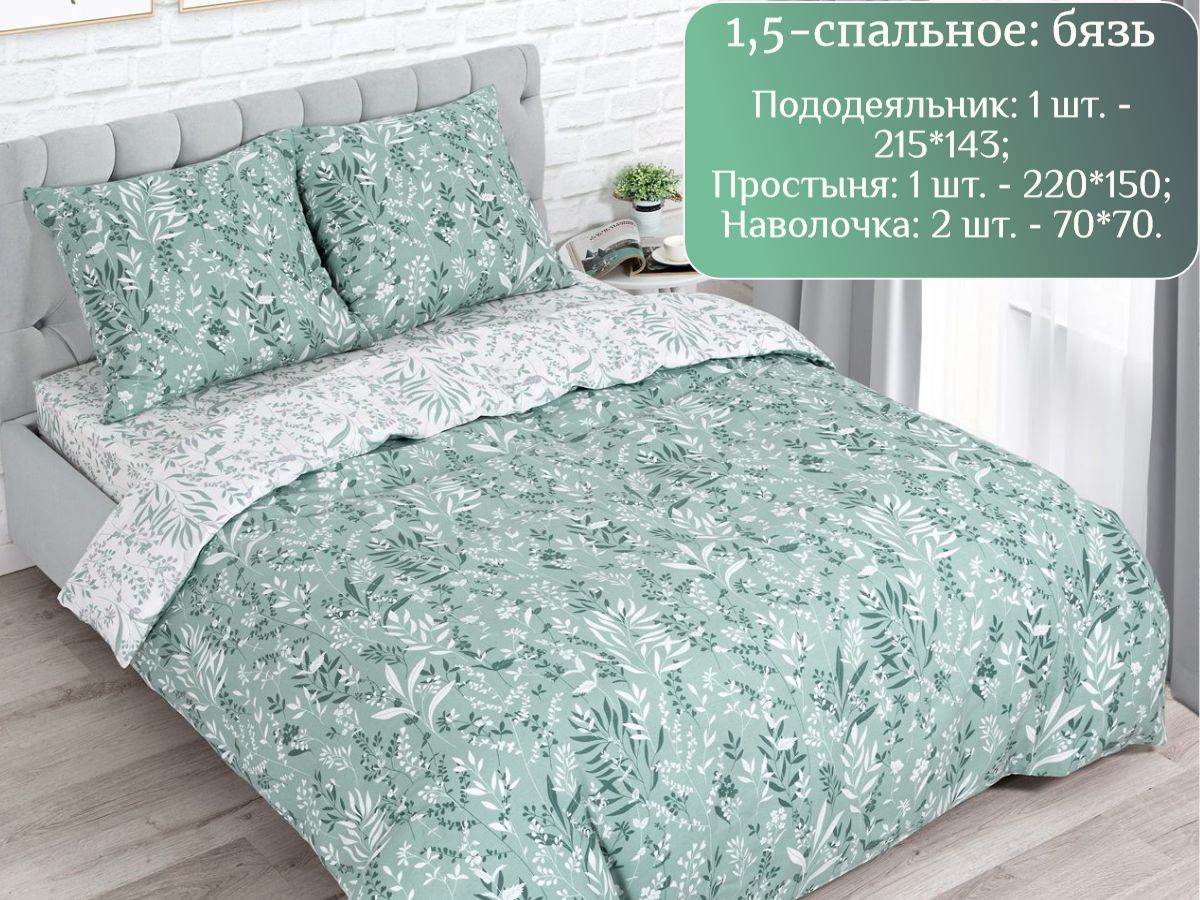 120 / зеленый / Женева / Растения / 1250 / ивановский текстиль / Полуторный / 143x215 / 1 одеяло, 1 простыня, 2 наволочки / 150x220 / Средняя / Унисекс / 4