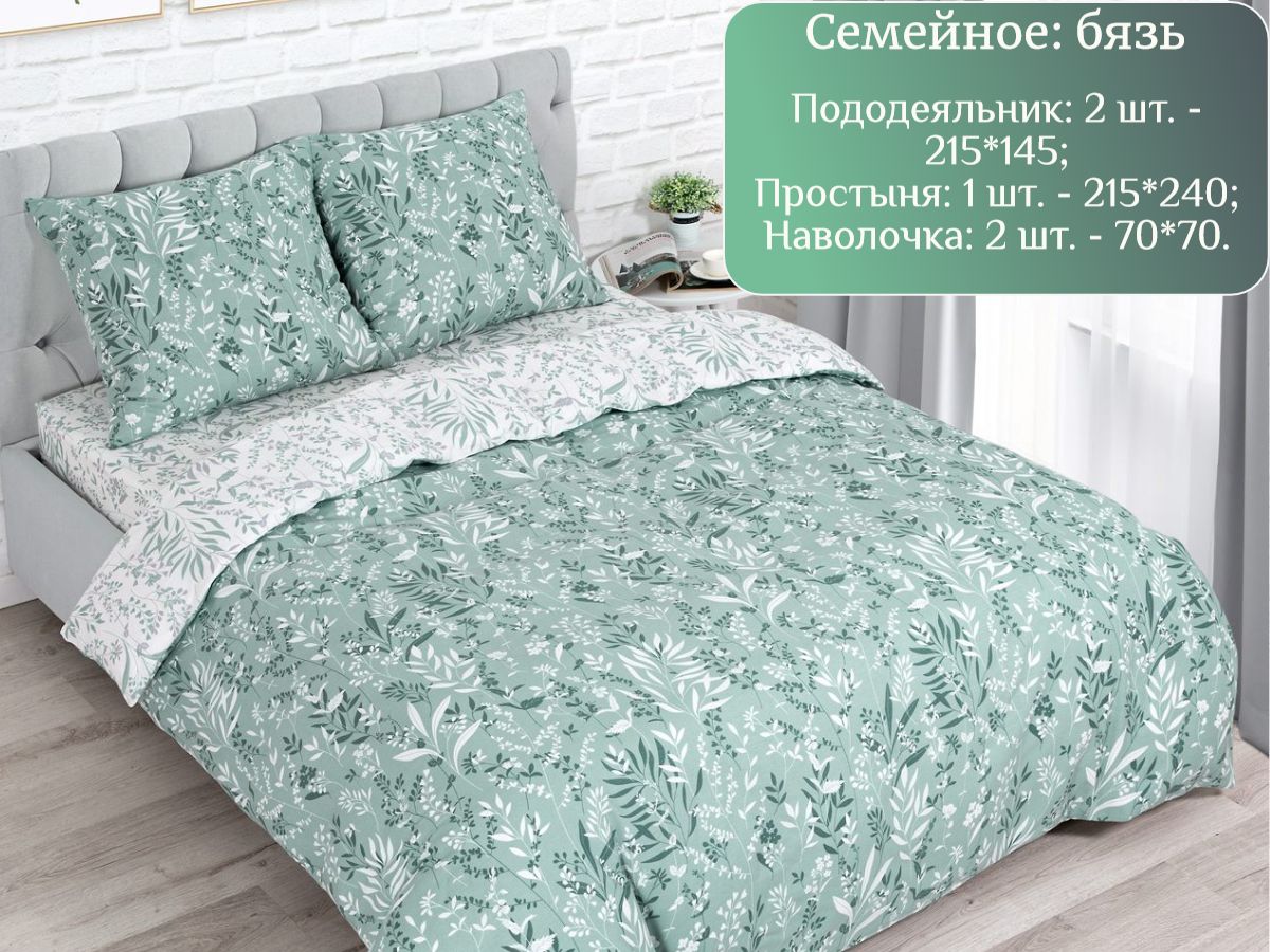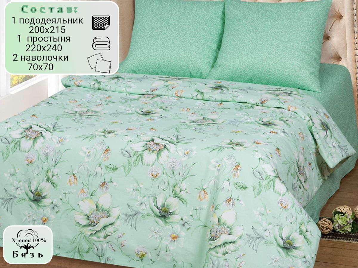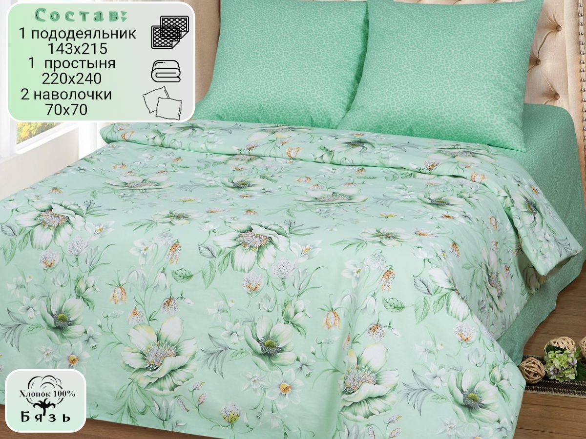 120 / зеленый / Женева / Растения / 1650 / ивановский текстиль / Двуспальный / 175x215 / 1 пододеяльник, 1 простыня, 2 наволочки / 200x215 / Высокая / Унисекс / 4