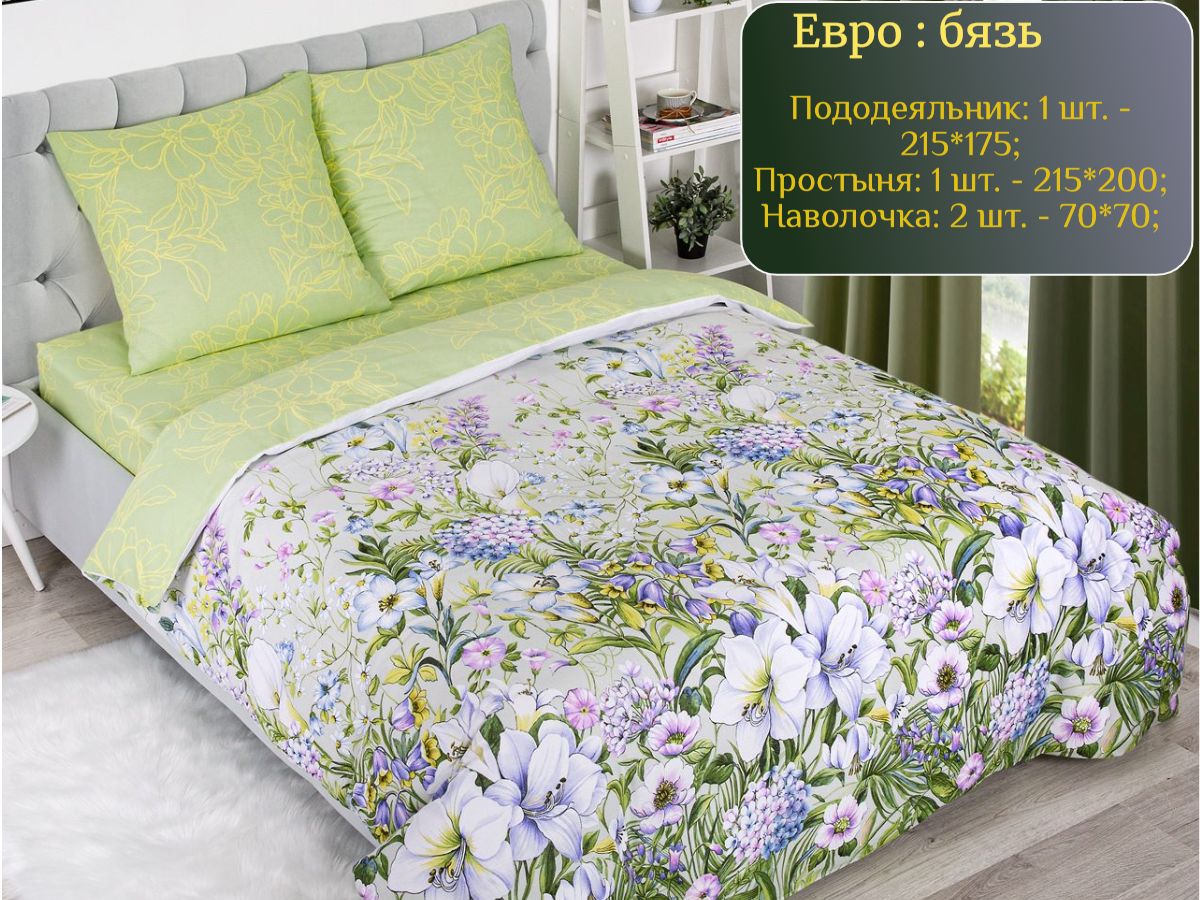 120 / зеленый / Женева / Растения / 1700 / ивановский текстиль / Евро / 200x215 / 1 пододеяльник, 1 простыня, 2 наволочки / 220x240 / Средняя / Унисекс / 4