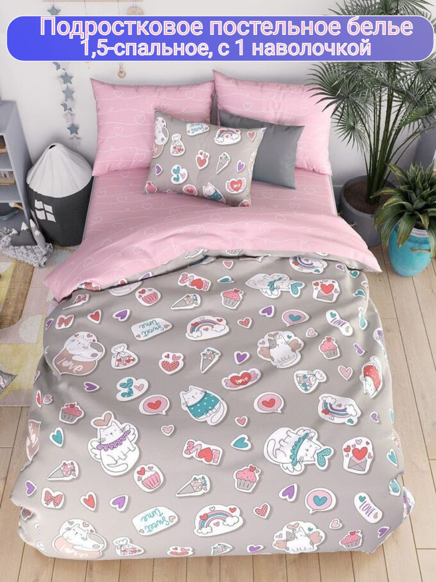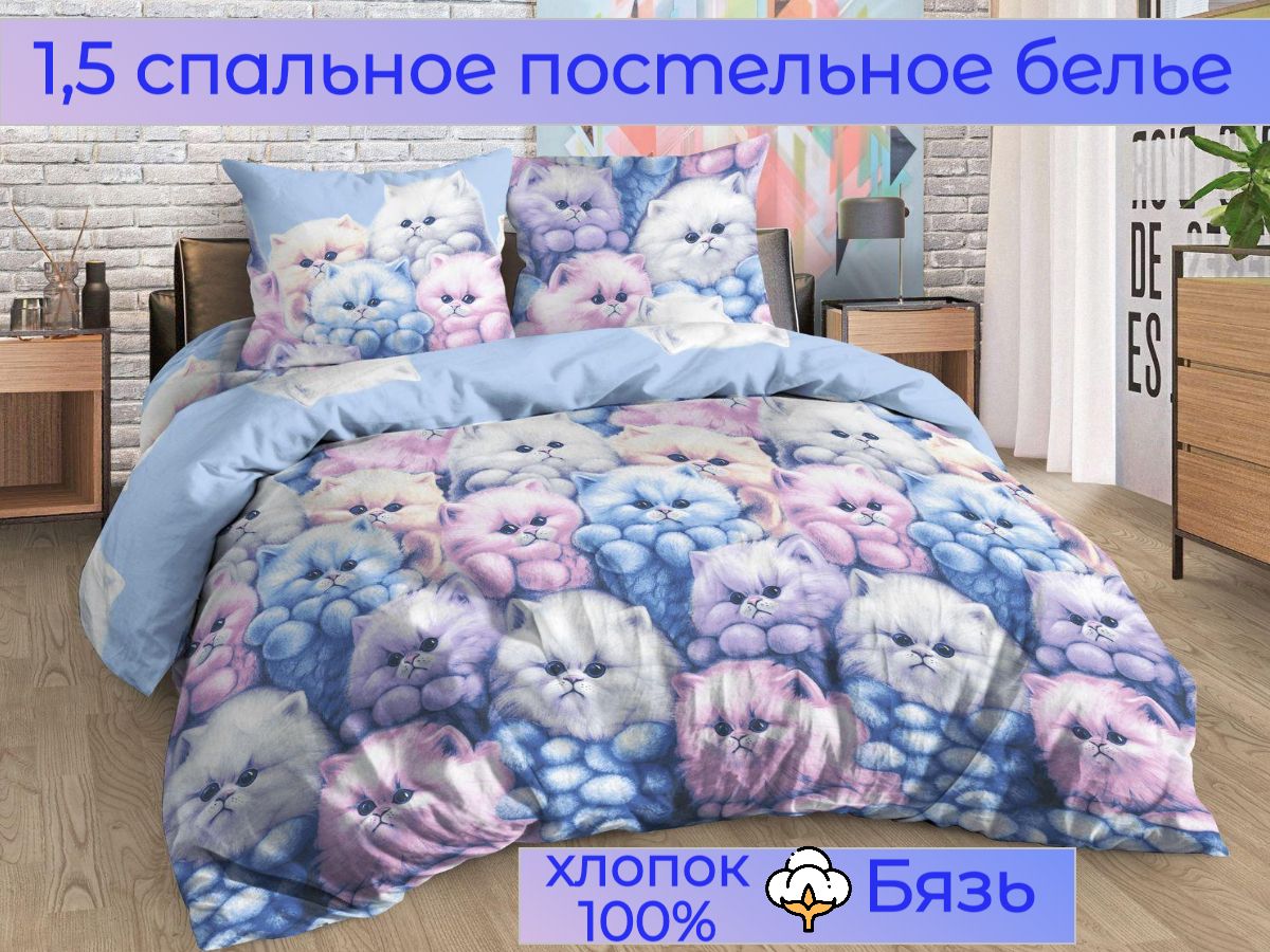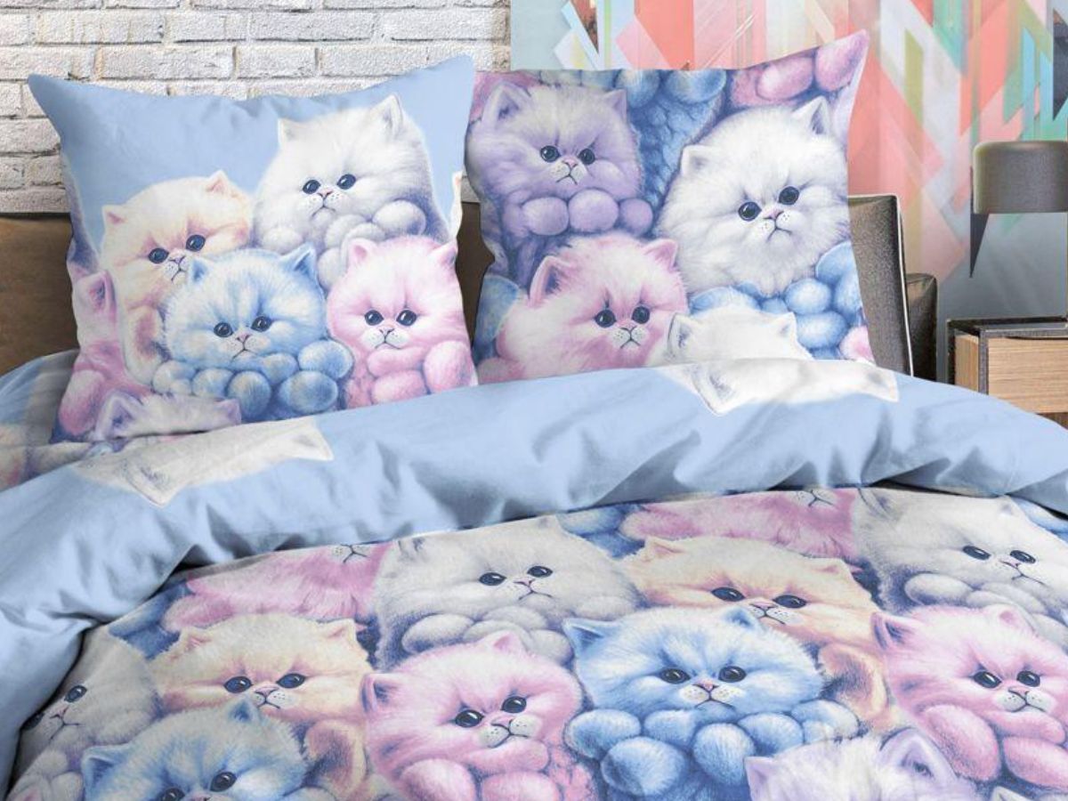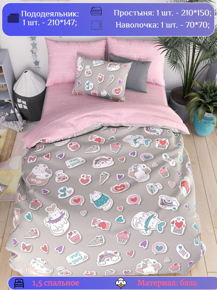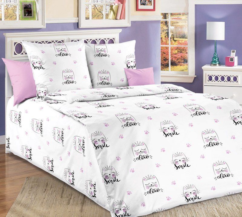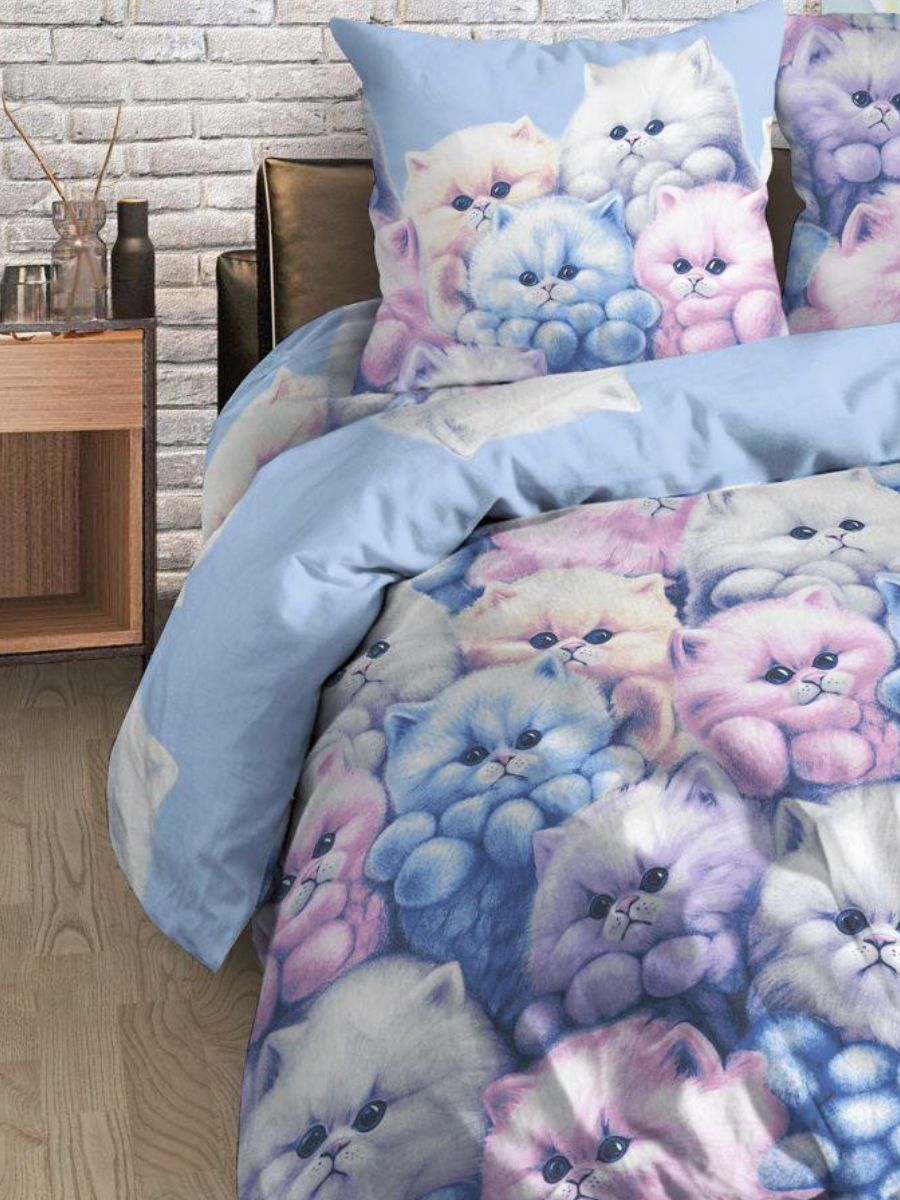120 / розовый / Пушистики / Кот, котёнок / 1250 / ивановский текстиль / Полуторный / 147x210 / 1 пододеяльник, 1 простыня, 1 наволочка / 150x210 / Высокая / Девочка / 3