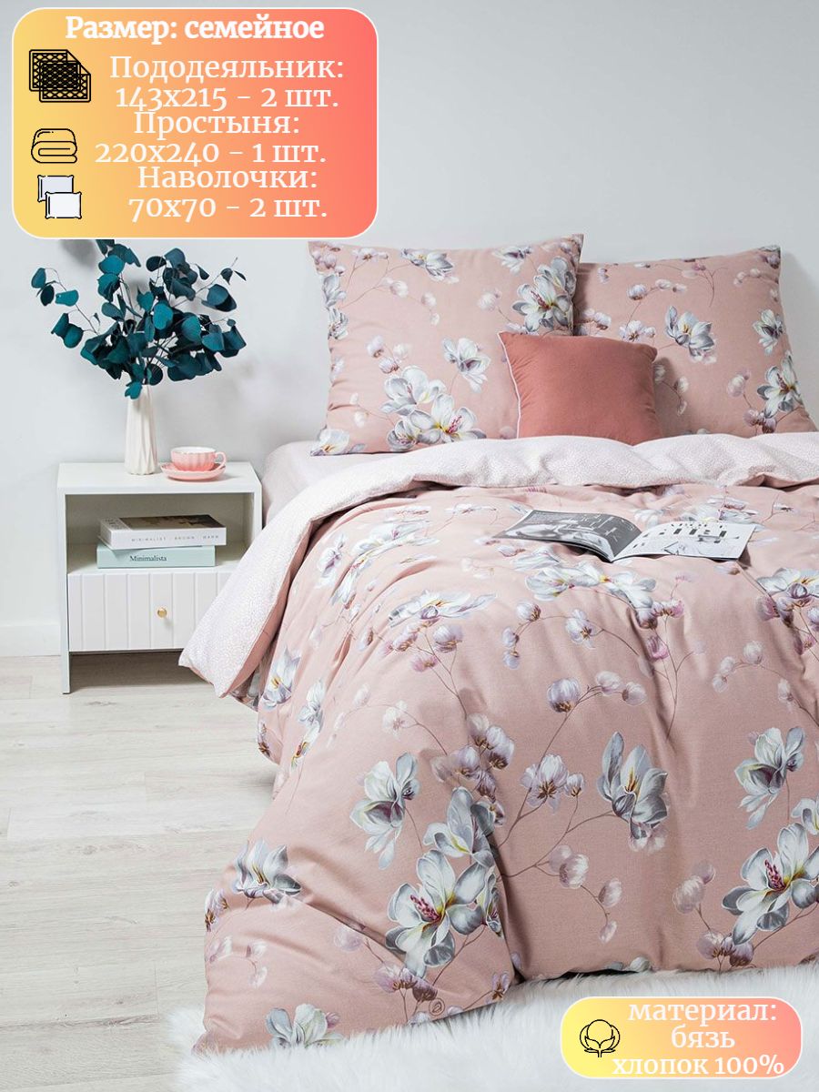 120 / белый / Магнолия / Цветы / 1850 / ивановский текстиль / Семейный / 143x215 / 2 пододеяльника, 1 простыня, 2 наволочки / 220x240 / Средняя / Унисекс / 5