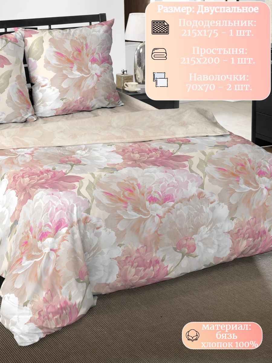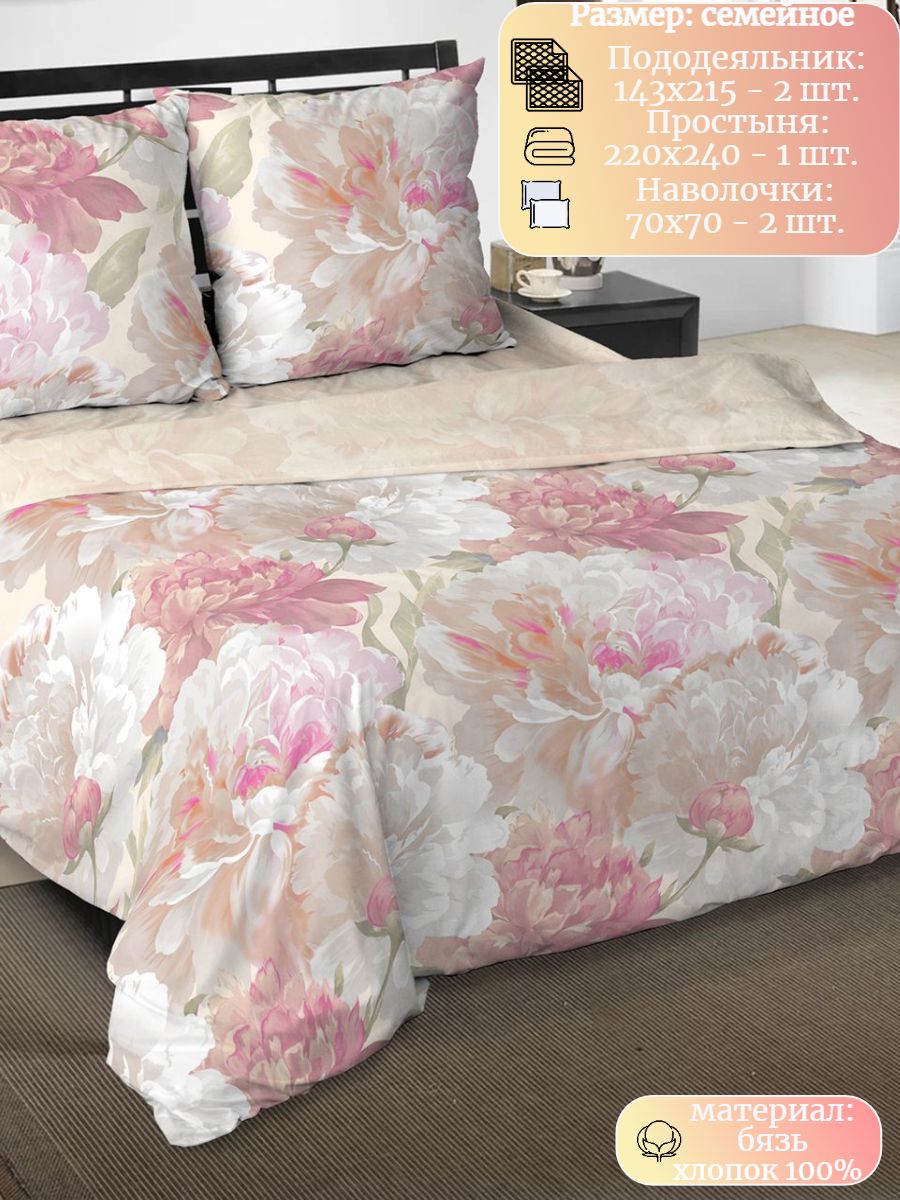 120 / бежевый / Сонет / Цветы / 1650 / ивановский текстиль / Двуспальный / 175x215 / 1 пододеяльник, 1 простыня, 2 наволочки / 200x215 / Высокая / Унисекс / 4