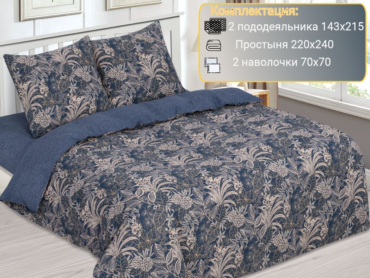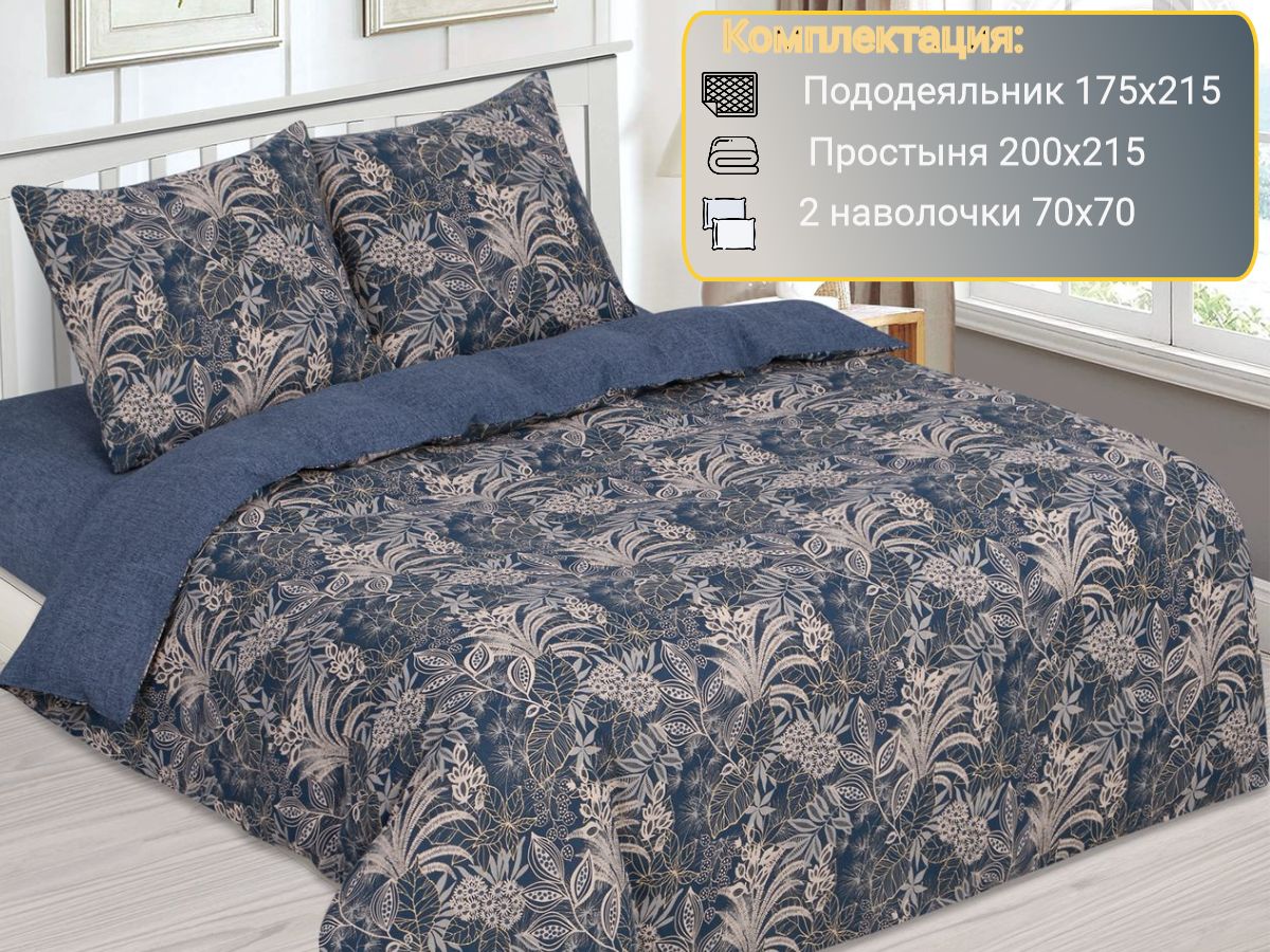120 / темно-синий / Лоренце / Растения / 1650 / ивановский текстиль / Двуспальный / 175x215 / 1 пододеяльник, 1 простыня, 2 наволочки / 200x215 / Высокая / Унисекс / 4
