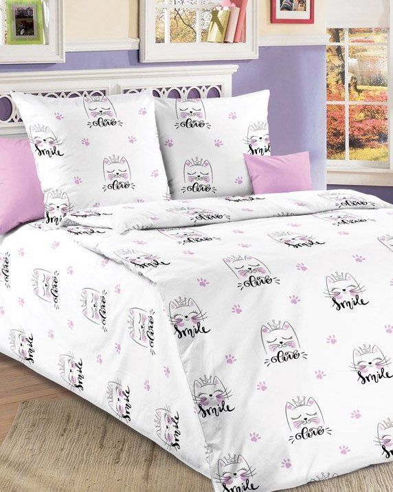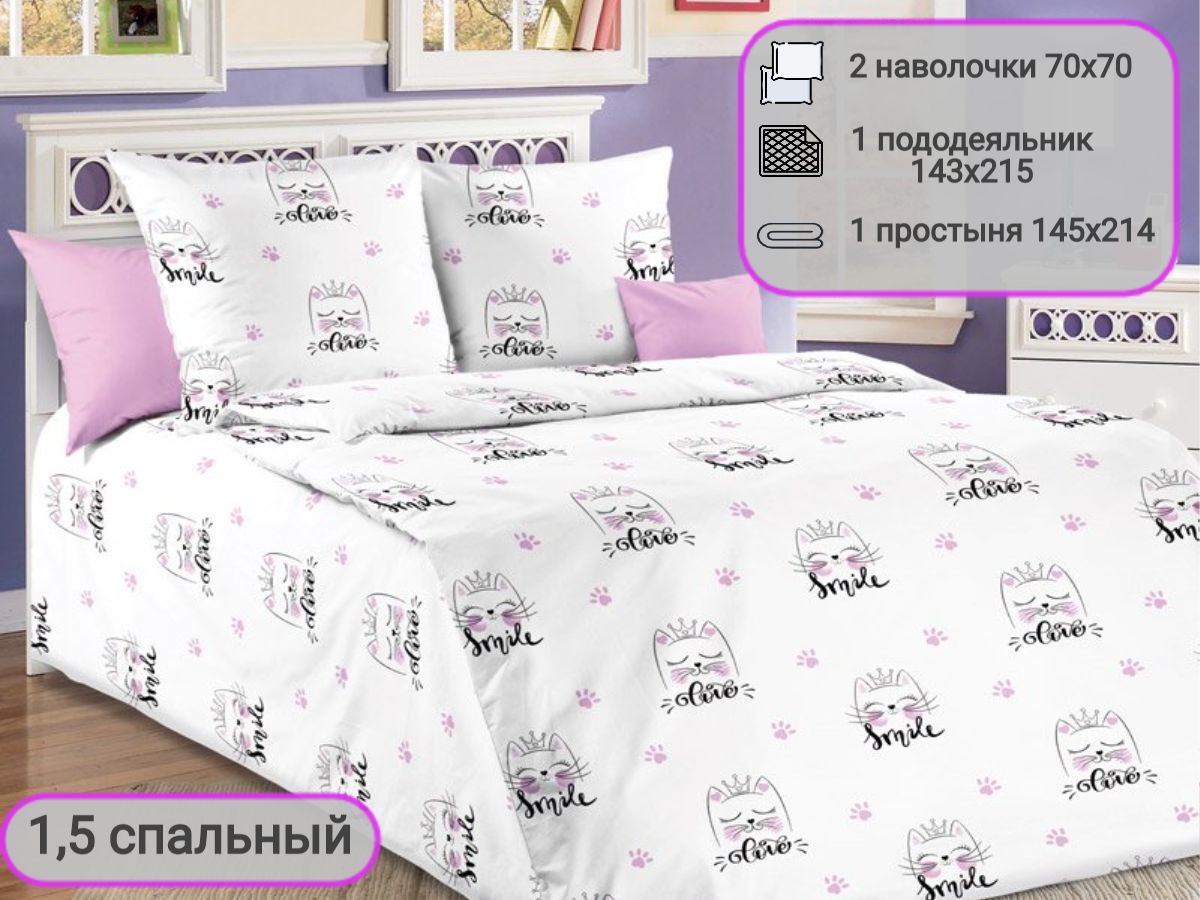 120 / белый / Кошечки / Кот, котёнок / 1100 / ивановский текстиль / Полуторный / 143x215 / 1 пододеяльник, 1 простыня, 2 наволочки / 145x214 / Средняя / Девочка / 4