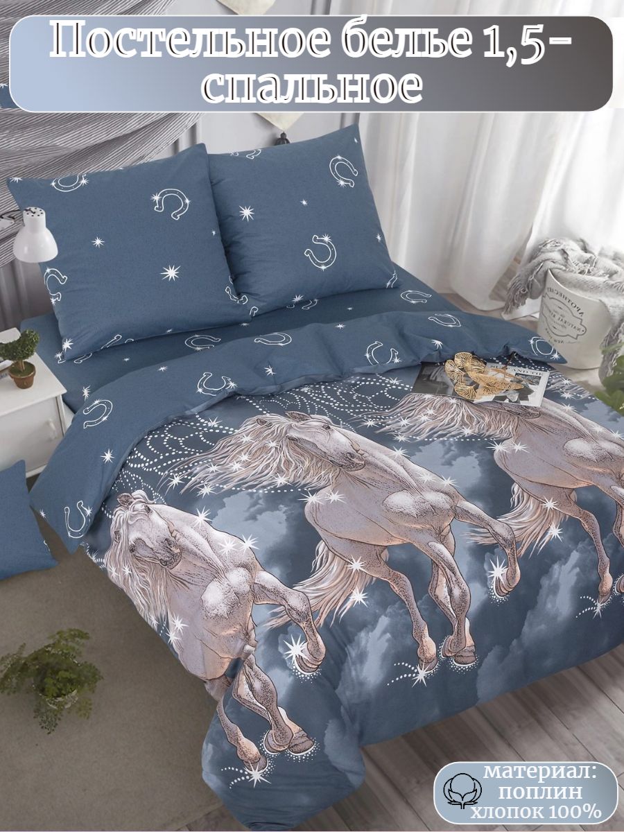 Новогодний комплект постельного белья с динамичным принтом белоснежного пегаса, летящего сквозь облака, яркий и практичный, выполнен из поплина плотностью 115 гр\кв.м., состав материала - 100% хлопок. В комплекте 4 предмета: 1 пододеяльник 215х145, 1 простыня 215х150 и 2 наволочки 70х70.