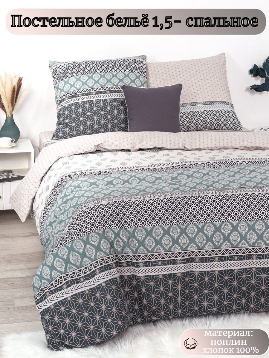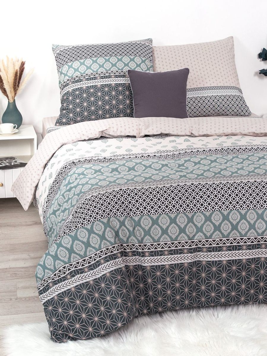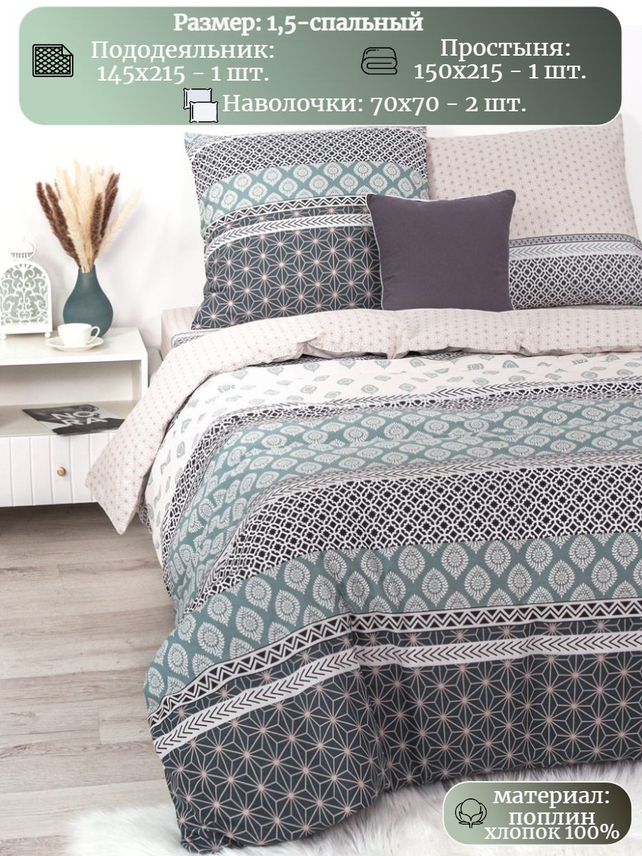 Комплект постельного белья с нежным геометрическим орнаментом, яркий и практичный, выполнен из поплина плотностью 115 гр\кв.м., состав материала - 100% хлопок. В комплекте 4 предмета: 1 пододеяльник 215х145, 1 простыня 215х150 и 2 наволочки 70х70.