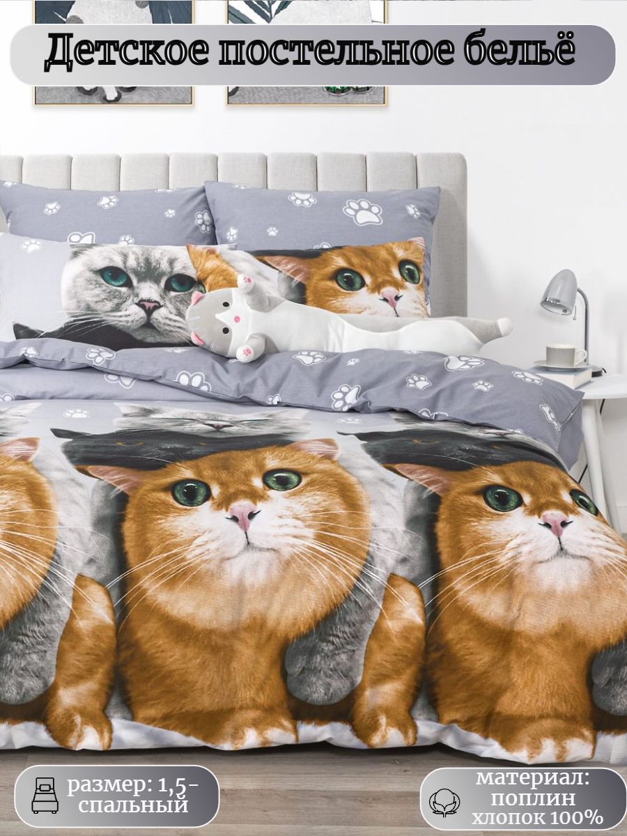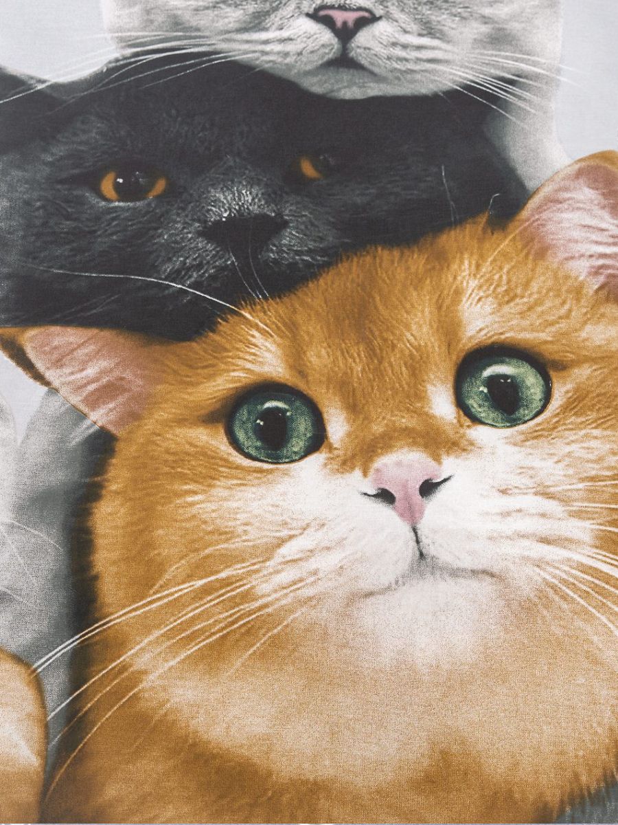 Комплект постельного белья с практичным принтом в виде котиков, яркий и гармоничный, выполнен из поплина плотностью 115 гр\кв.м., состав материала - 100% хлопок. В комплекте 4 предмета: 1 пододеяльник 215х145, 1 простыня 215х150 и 2 наволочки 70х70.