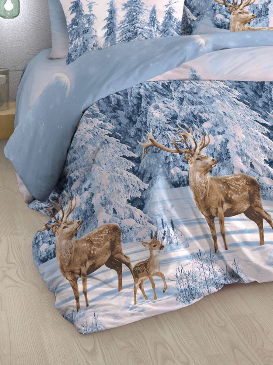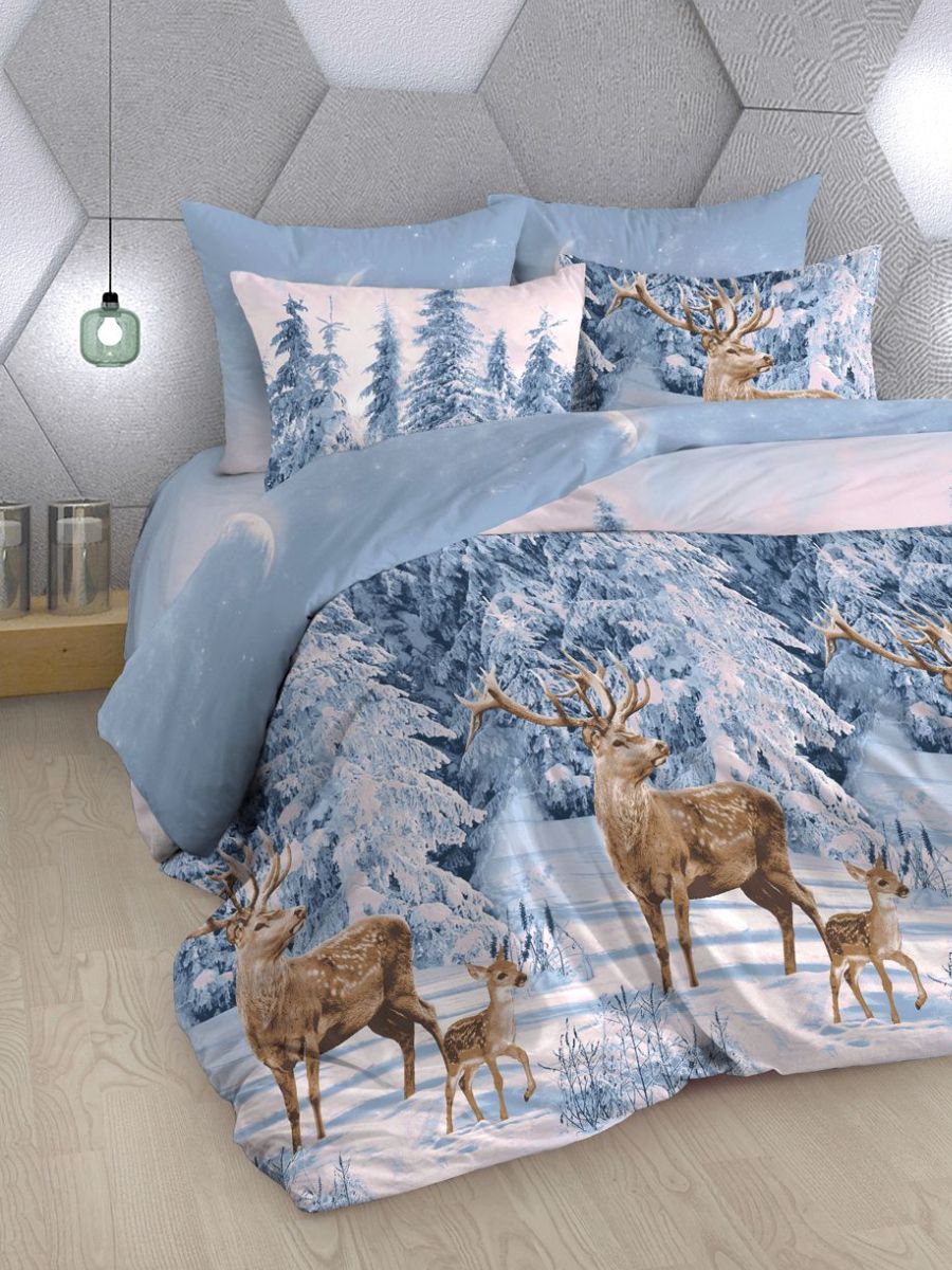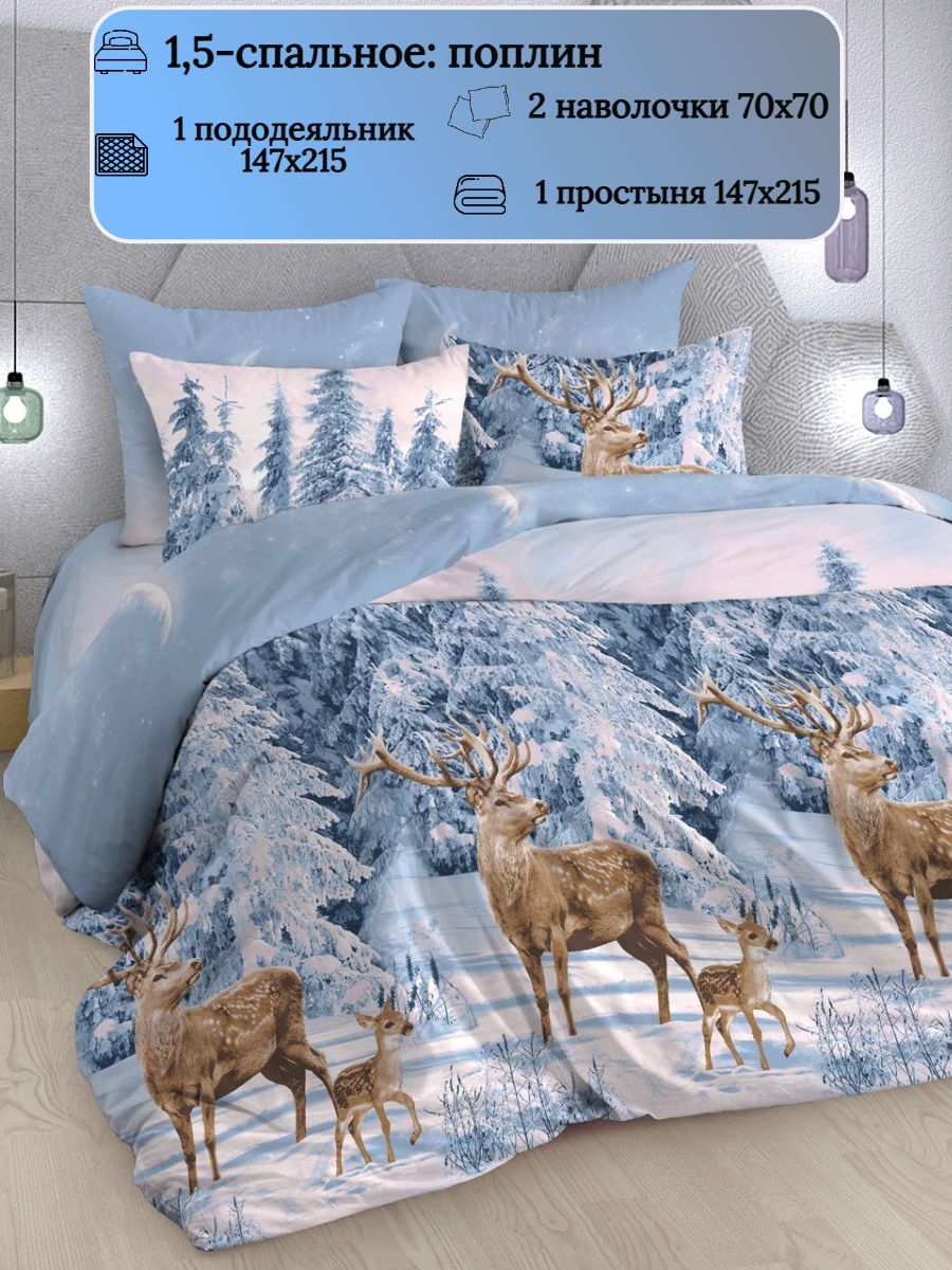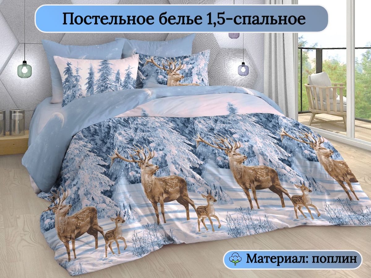 Комплект постельного белья с ярким новогодним принтом выполнен из поплина плотностью 115 гр./ кв.м., состав комплекта - 100% хлопок. практичный 1,5 спальный комплект полностью сшит из ткани с основным рисунком. Состав комплекта: 1 пододеяльник 143х215, 1 простыня 145-150х215 и 2 наволочки 70х70 см.