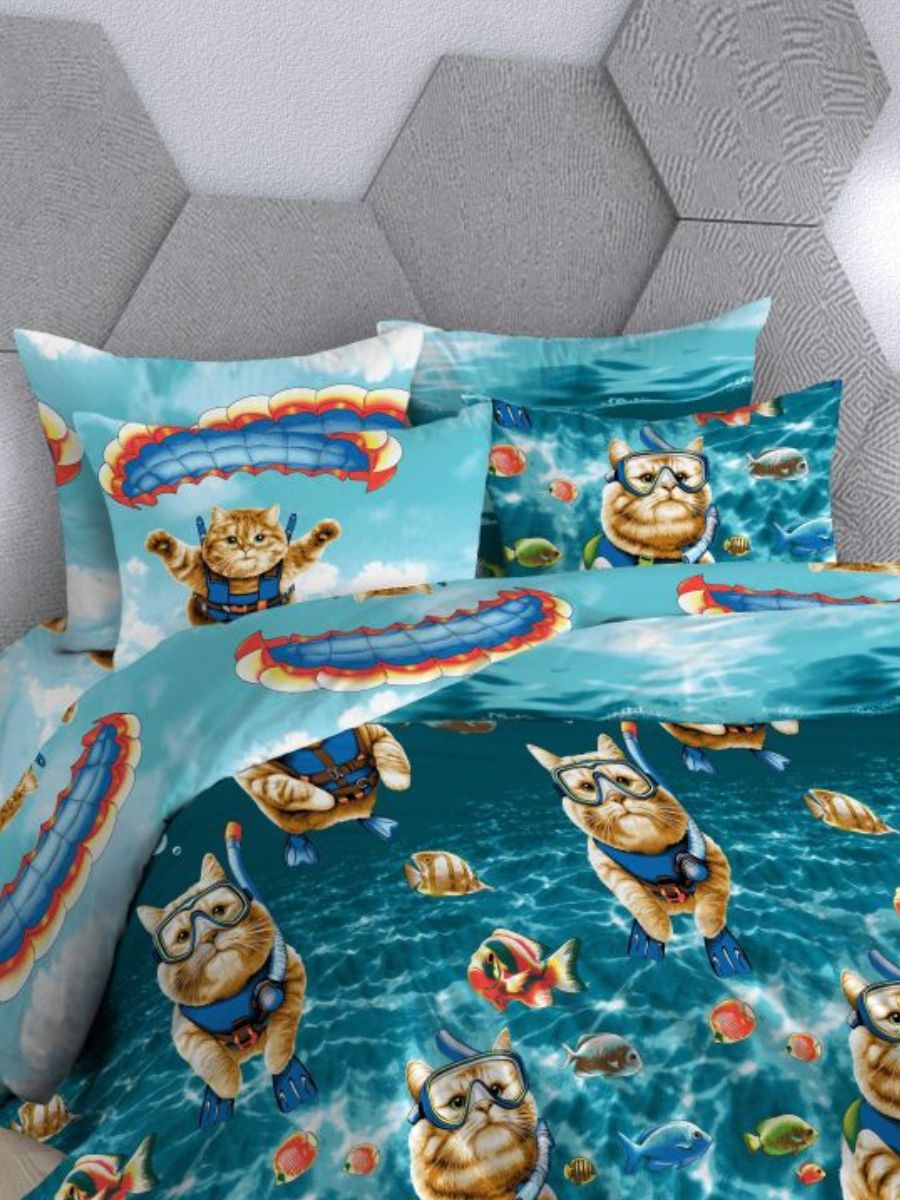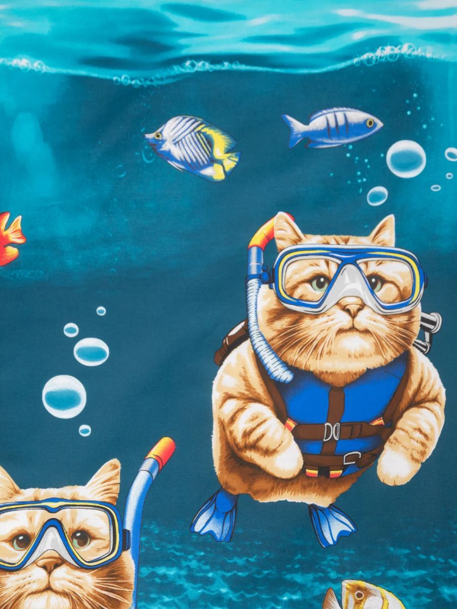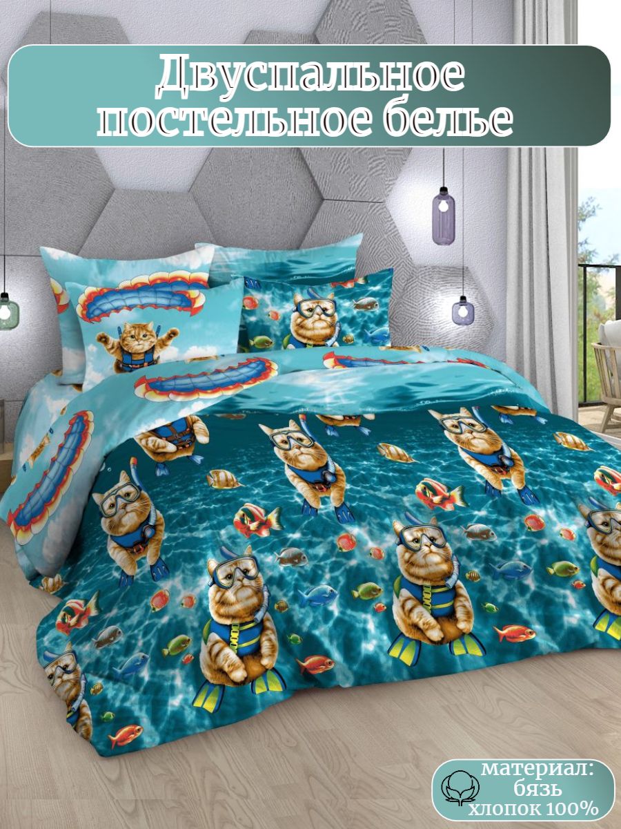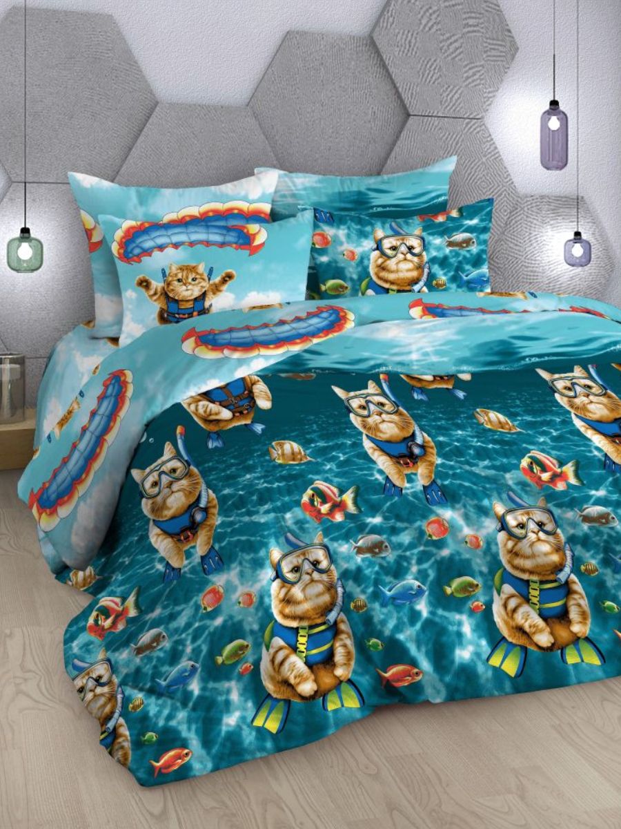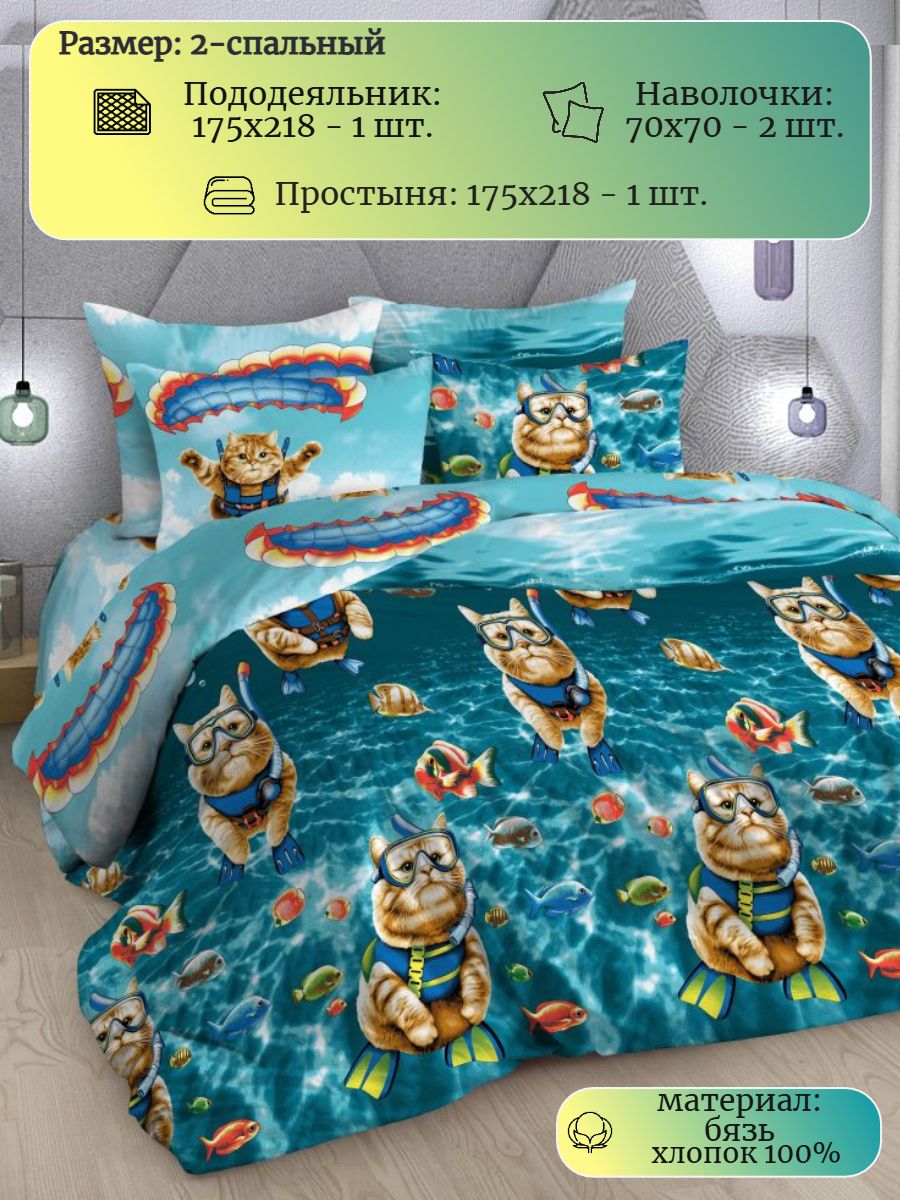 Комплект постельного белья из бязи с ярким принтом ныряющих котиков порадует тех, кого вдохновляют пушистые питомцы. Постельное бельё выполнено в практичных тонах, изготовлено из 100% хлопка (ткань бязь, плотность 120 гр./ кв.м.) Натуральный хлопок не вызывает аллергии, гигроскопичен, хорошо пропускает воздух, позволяя телу дышать. Комплект состоит из пододеяльника размером 175х218 см., простыни размером 175х218 см. и 2 наволочек размером 70х70 см. Комплект постельного белья с ярким принтом станет прекрасным подарком на любой праздник.