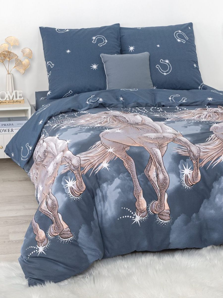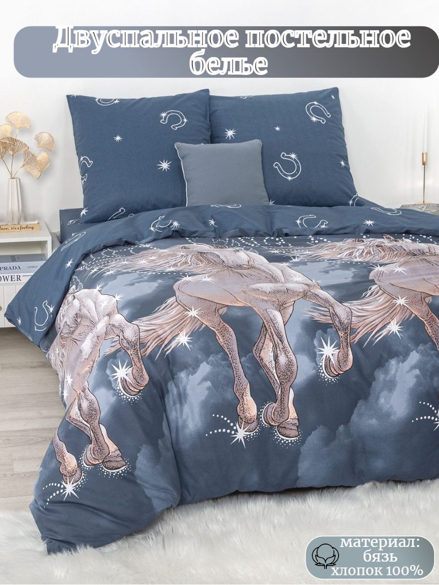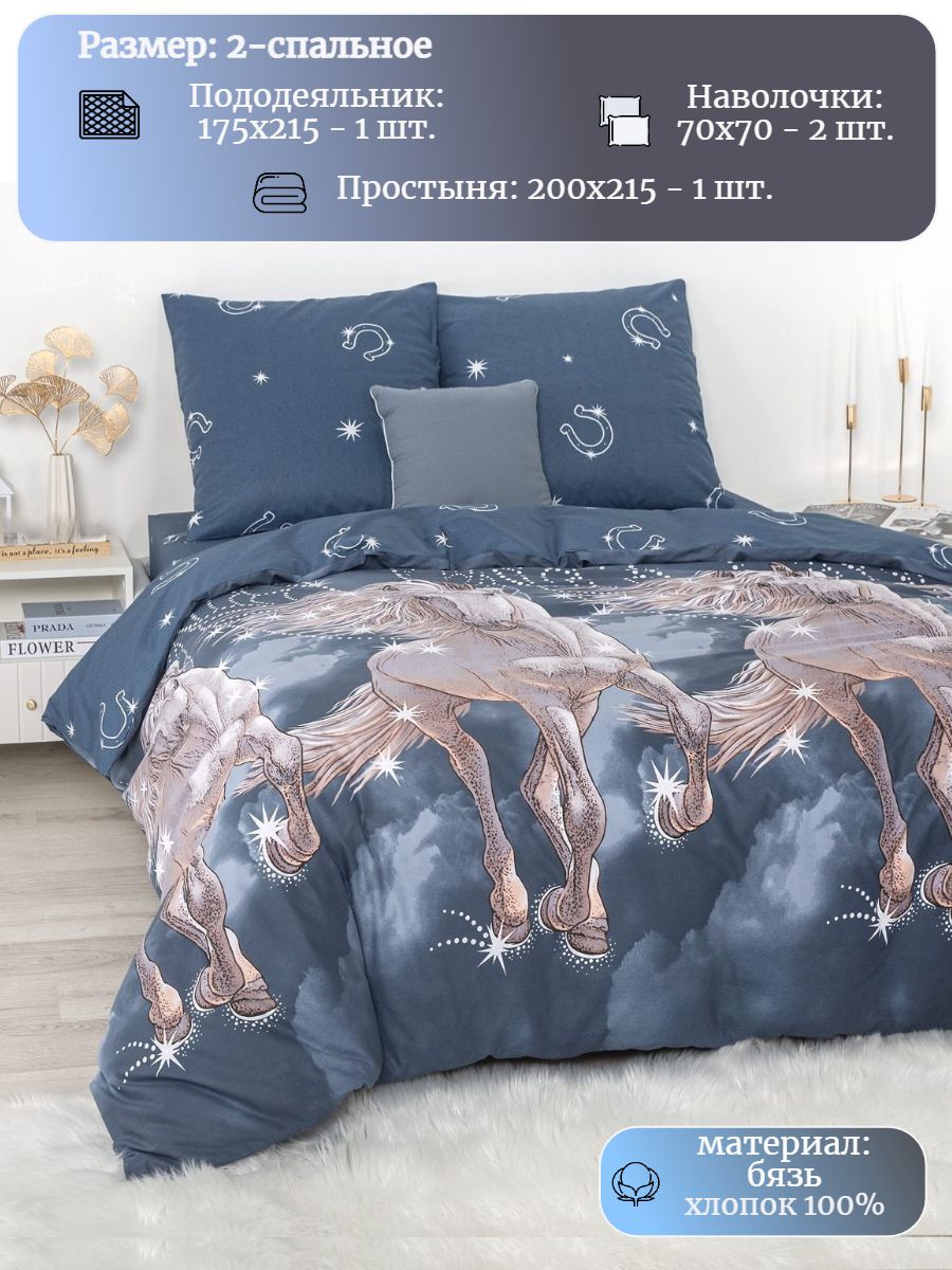 Комплект постельного белья из бязи с символом наступающего года - коня с развевающейся гривой порадует всех домочадцев. Постельное бельё выполнено в практичных тонах, изготовлено из 100% хлопка (ткань бязь, плотность 120 гр./ кв.м.) Натуральный хлопок не вызывает аллергии, гигроскопичен, хорошо пропускает воздух, позволяя телу дышать. Комплект состоит из пододеяльника размером 175х215 см., простыни размером 200х215 см. и 2 наволочек размером 70х70 см. Комплект постельного белья с ярким принтом станет прекрасным подарком на любой праздник.
