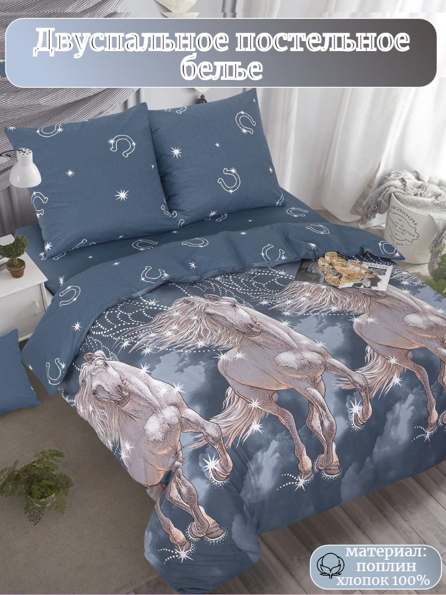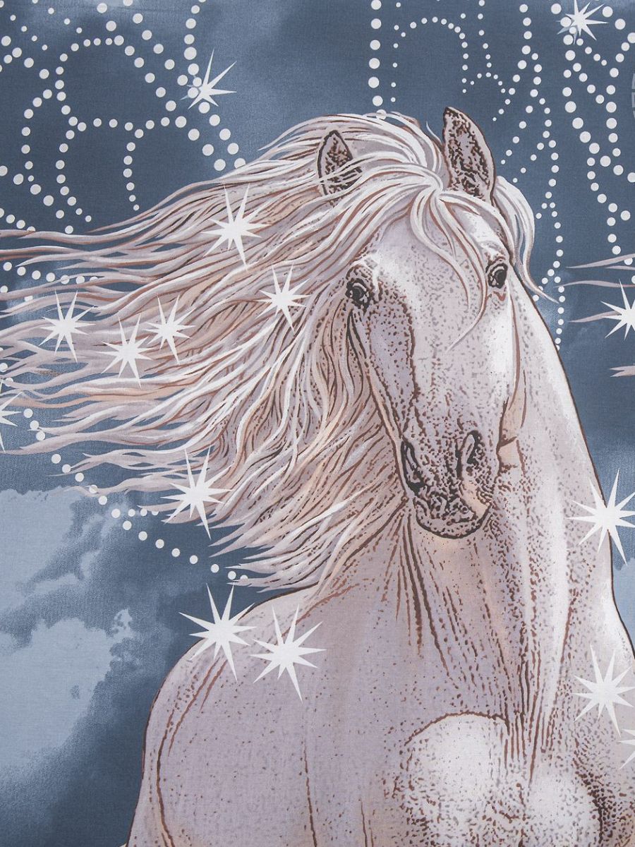 Новогодний комплект постельного белья из поплина плотностью 110±5 гр./кв.м. Двуспальное постельное белье с динамичным принтом белоснежного пегаса, летящего сквозь облака подарит нежность и отличное настроение, принесет уют, тепло и покой в ваш дом. Комплект состоит из пододеяльника 215х175 - 1 шт., простыни 215х200 - 1 шт., и наволочек 70х70 - 2 шт.