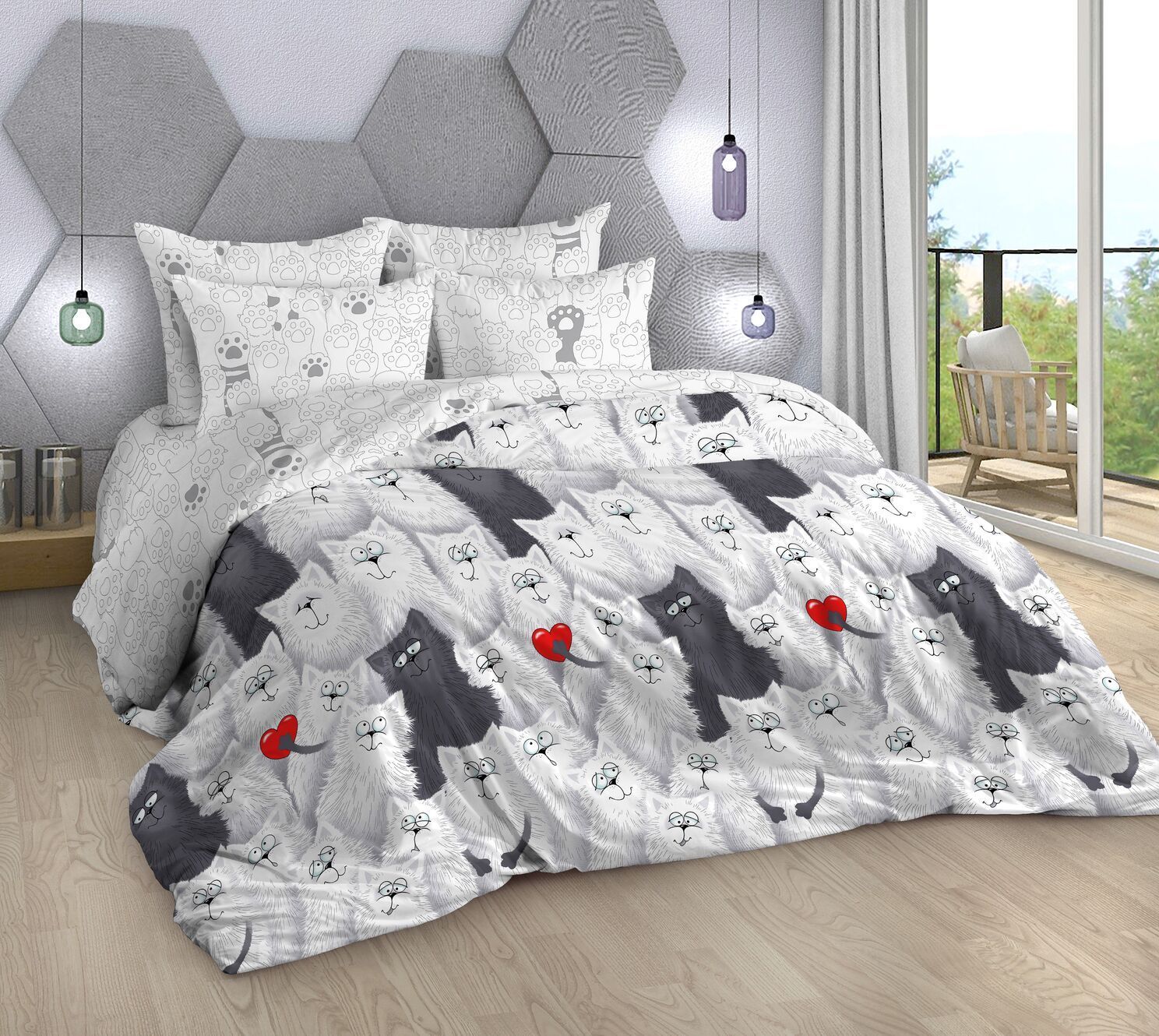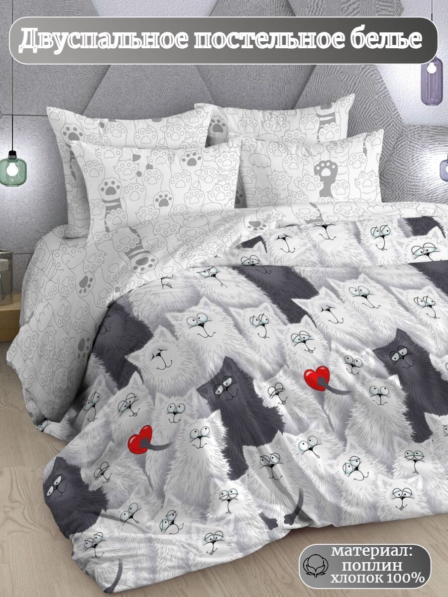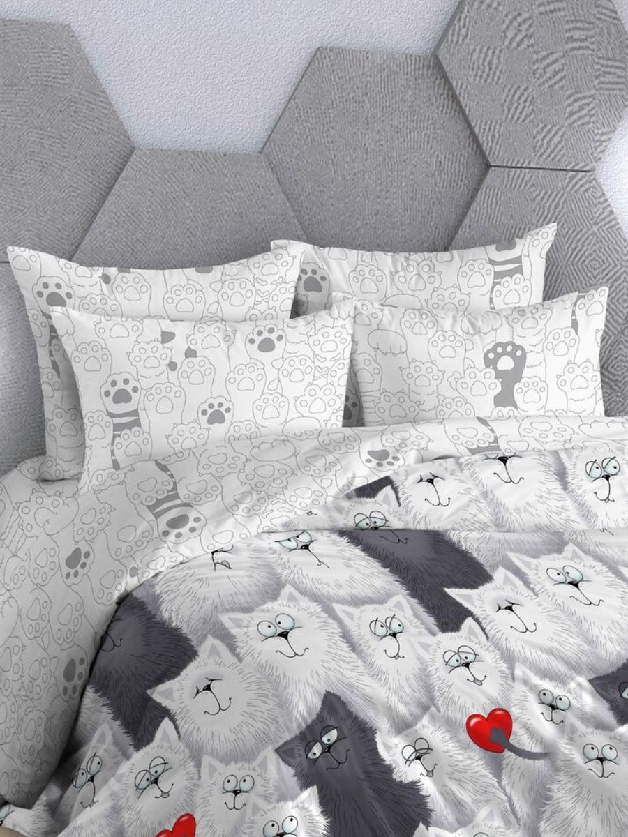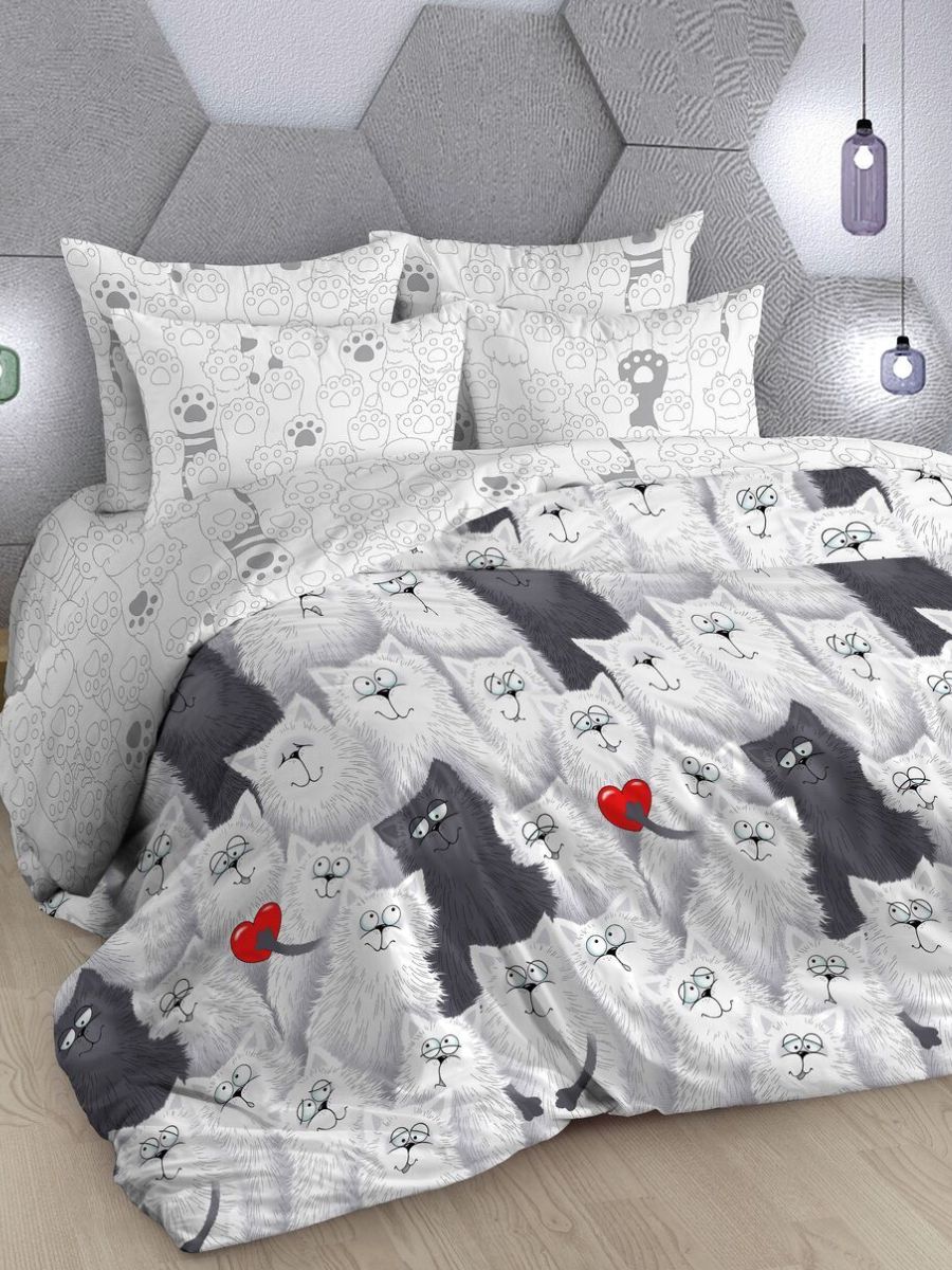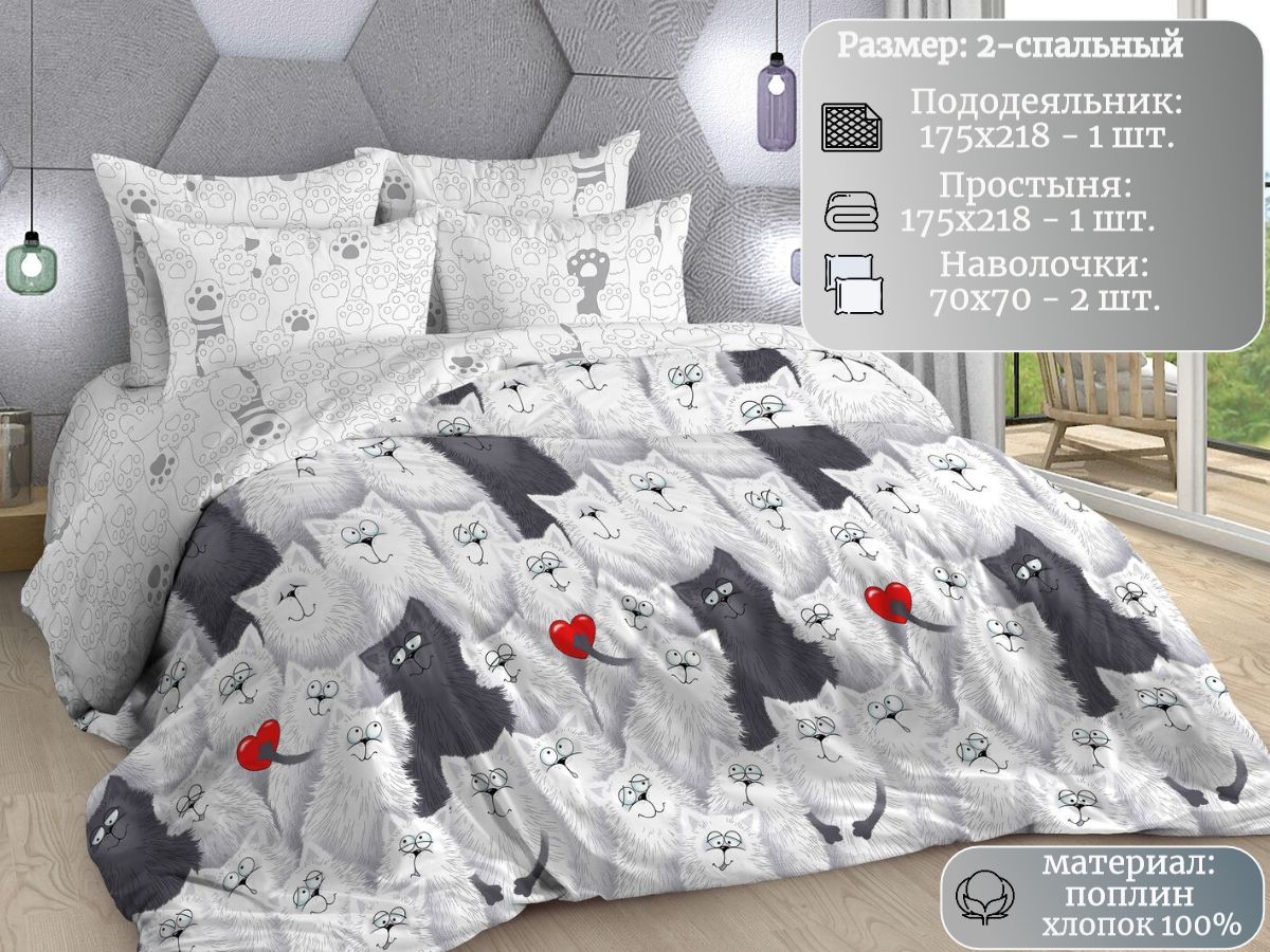 Нежный комплект постельного белья из поплина плотностью 110±5 гр./кв.м. Двуспальное постельное белье с озорным кошачьим принтом подарит нежность и отличное настроение, принесет уют, тепло и покой в ваш дом. Комплект состоит из пододеяльника 218х175 - 1 шт., простыни 218х175 - 1 шт., и наволочек 70х70 - 2 шт.