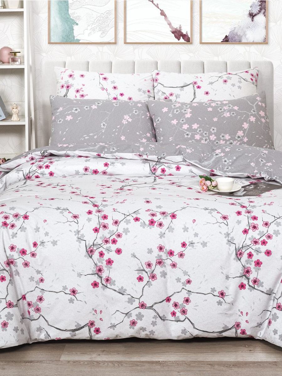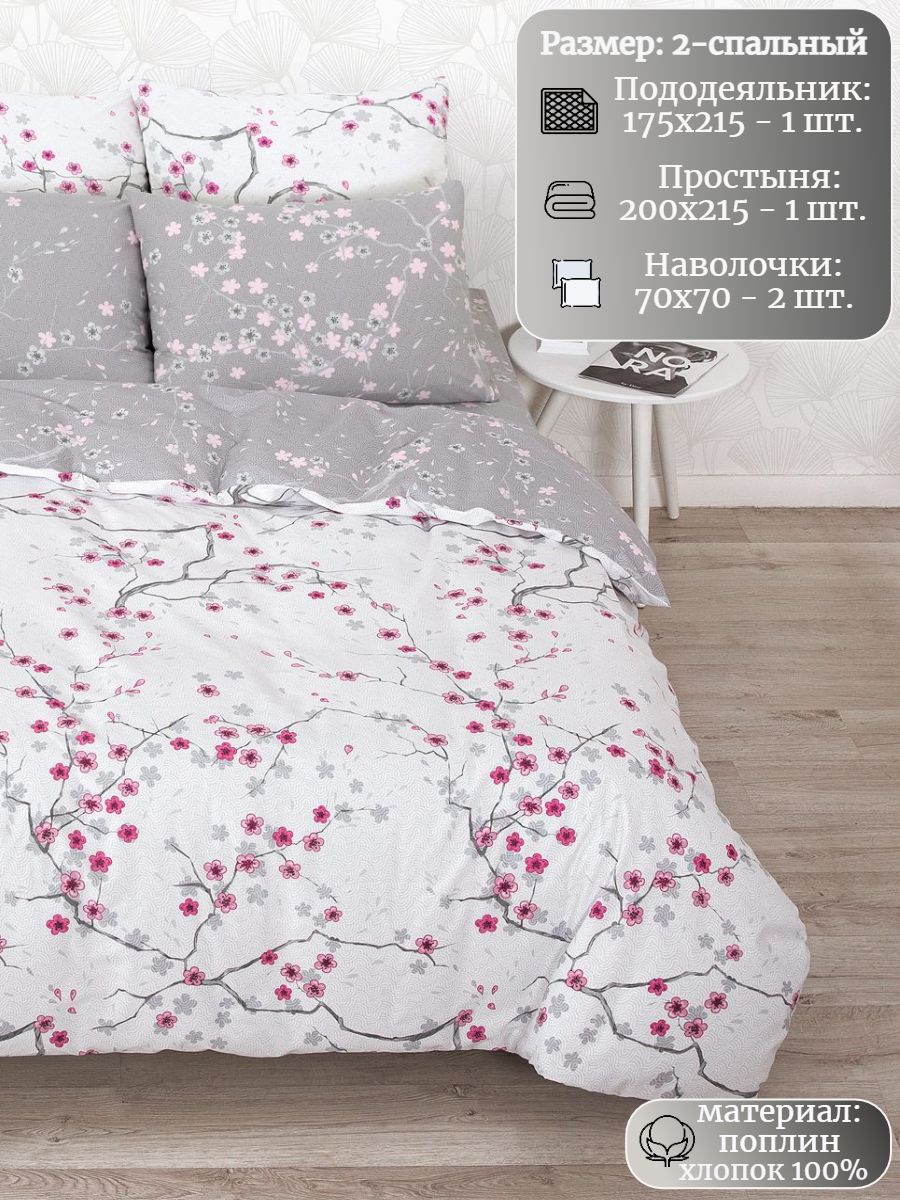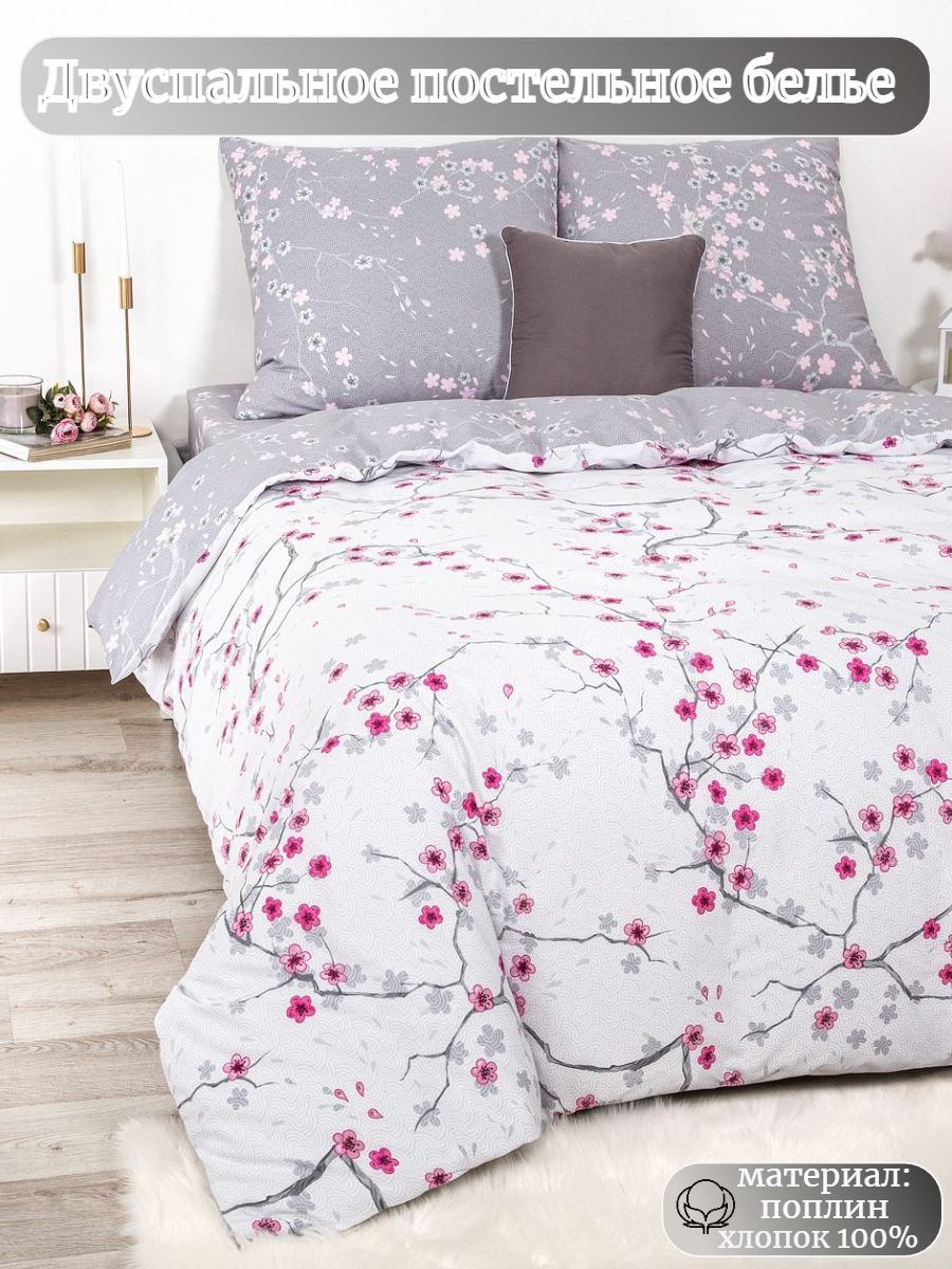 Нежный комплект постельного белья из поплина плотностью 110±5 гр./кв.м. Двуспальное постельное белье с цветочным принтом подарит нежность и отличное настроение, принесет уют, тепло и покой в ваш дом. Комплект состоит из пододеяльника 215х175 - 1 шт., простыни 215х200 - 1 шт., и наволочек 70х70 - 2 шт.