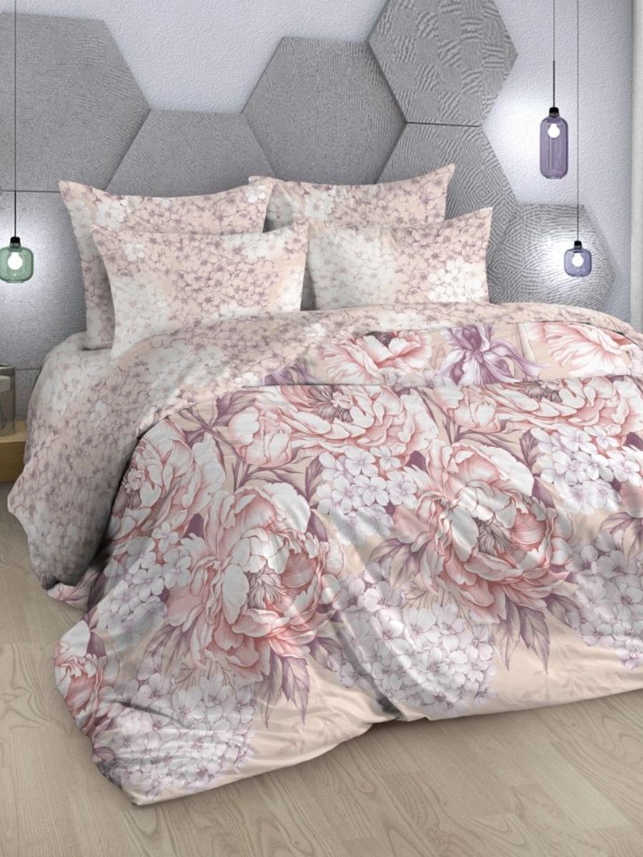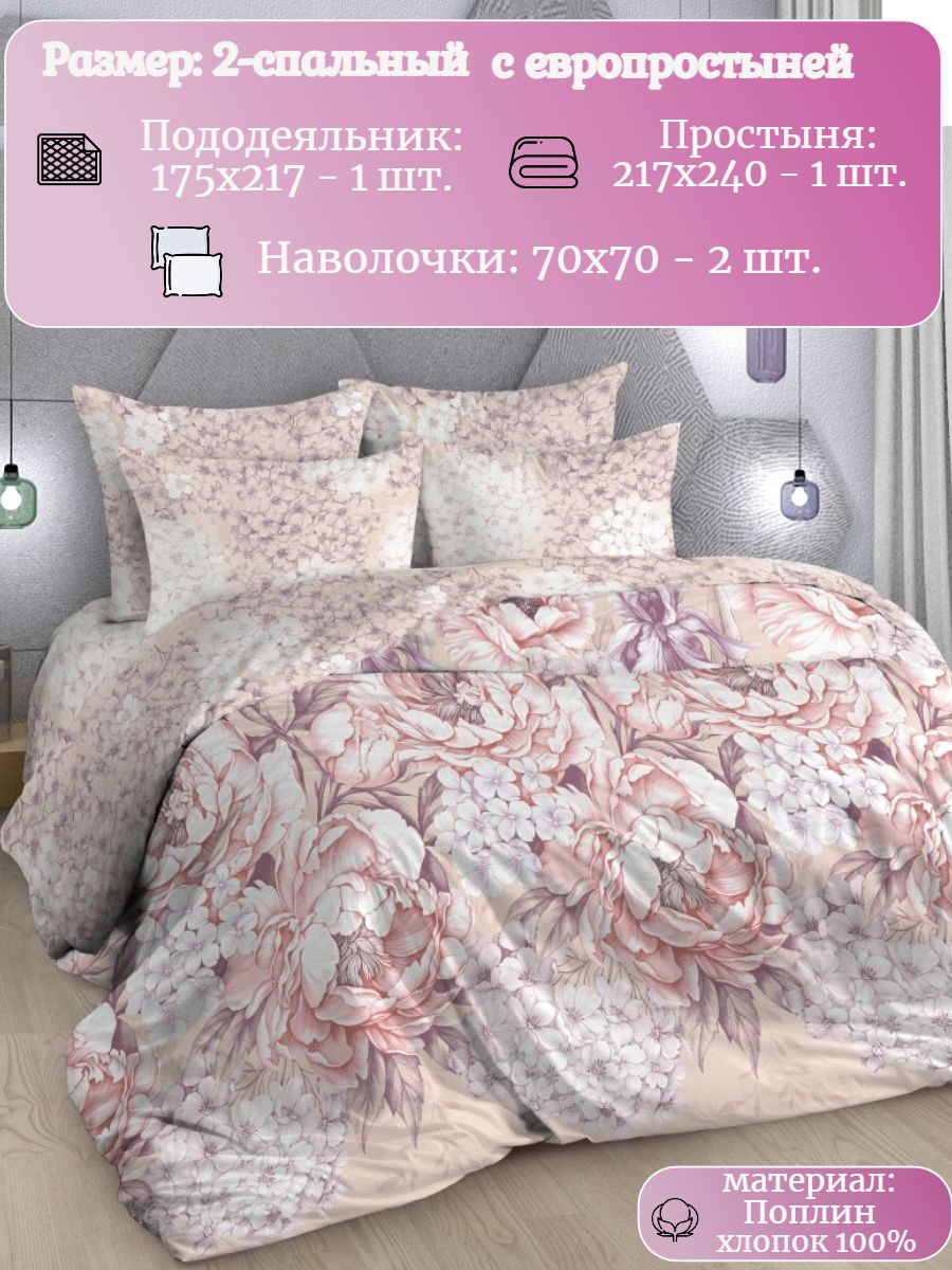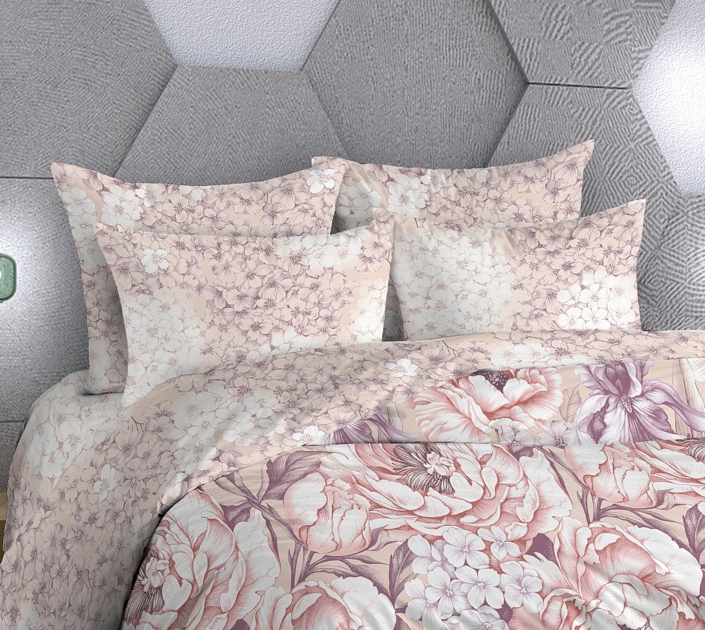 Нежный комплект постельного белья из поплина плотностью 110±5 гр./кв.м. Двуспальное постельное белье с растительным принтом подарит нежность и отличное настроение, принесет уют, тепло и покой в ваш дом. Комплект состоит из пододеяльника 218х175 - 1 шт., простыни 218х240 - 1 шт., и наволочек 70х70 - 2 шт.