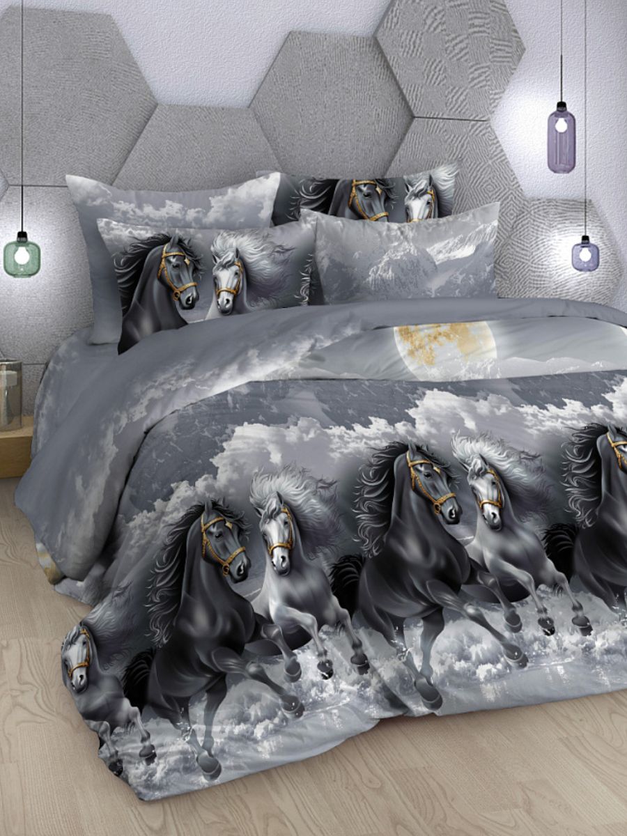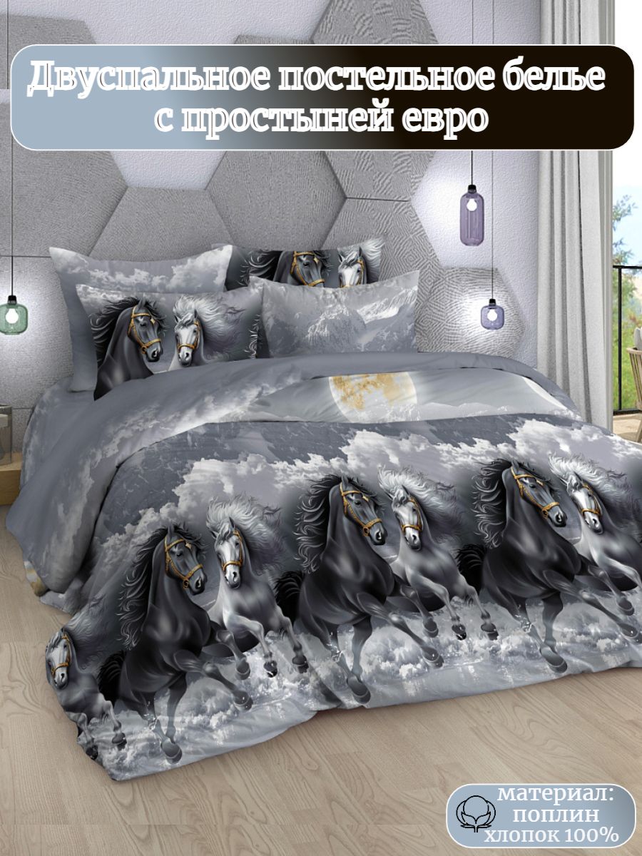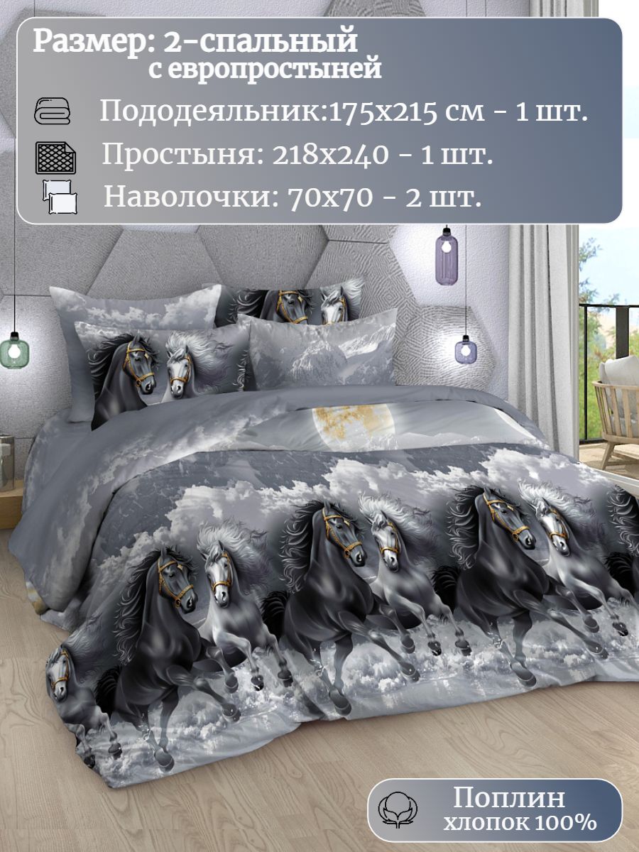 Новогодний комплект постельного белья с динамичным принтом пары мчащихся коней подарит праздничное настроение. Комплект изготовлен из поплина (состав: хлопок 100%) плотностью 117 гр/кв.м. Постельное бельё состоит из 4х предметов: пододеяльник: 215х175 - 1 шт., простыня: 218х240 - 1 шт, наволочки: 70х70 - 2 шт.