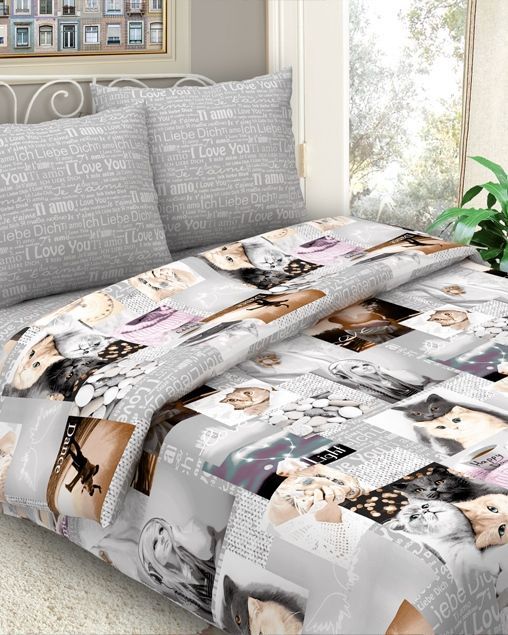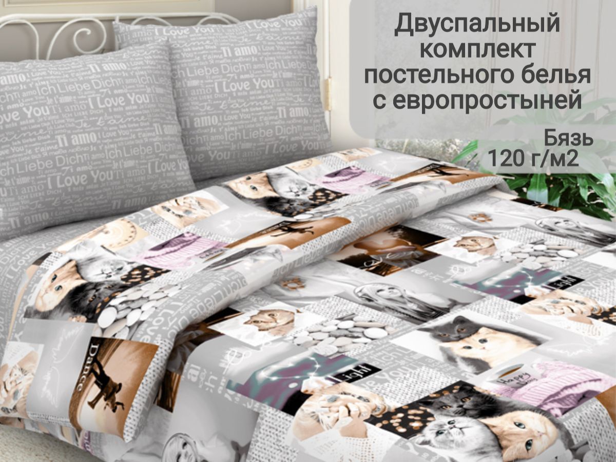 Романтический комплект постельного белья изготовлен из бязи плотностью 120 гр/кв.м. Постельное бельё выполнено в практичных тонах, изготовлено из 100% хлопка (ткань бязь, плотность 120 гр./ кв.м.) Натуральный хлопок не вызывает аллергии, гигроскопичен, хорошо пропускает воздух, позволяя телу дышать. Практичная цветовая гамма и принт с милыми котятами подарят уют и комфортный сон. Комплект состоит из пододеяльника, сшитого из ткани с основным принтом и простыни и наволочек, сшитых из ткани-компаньона. Размеры комплекта 2 спальный с европростыней: Пододеяльник: 175х215 - 1 шт. Простыня: 220х240 - 1 шт. Наволочки: 70х70 - 2 шт.