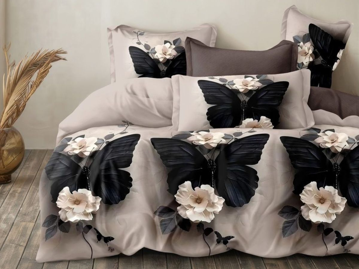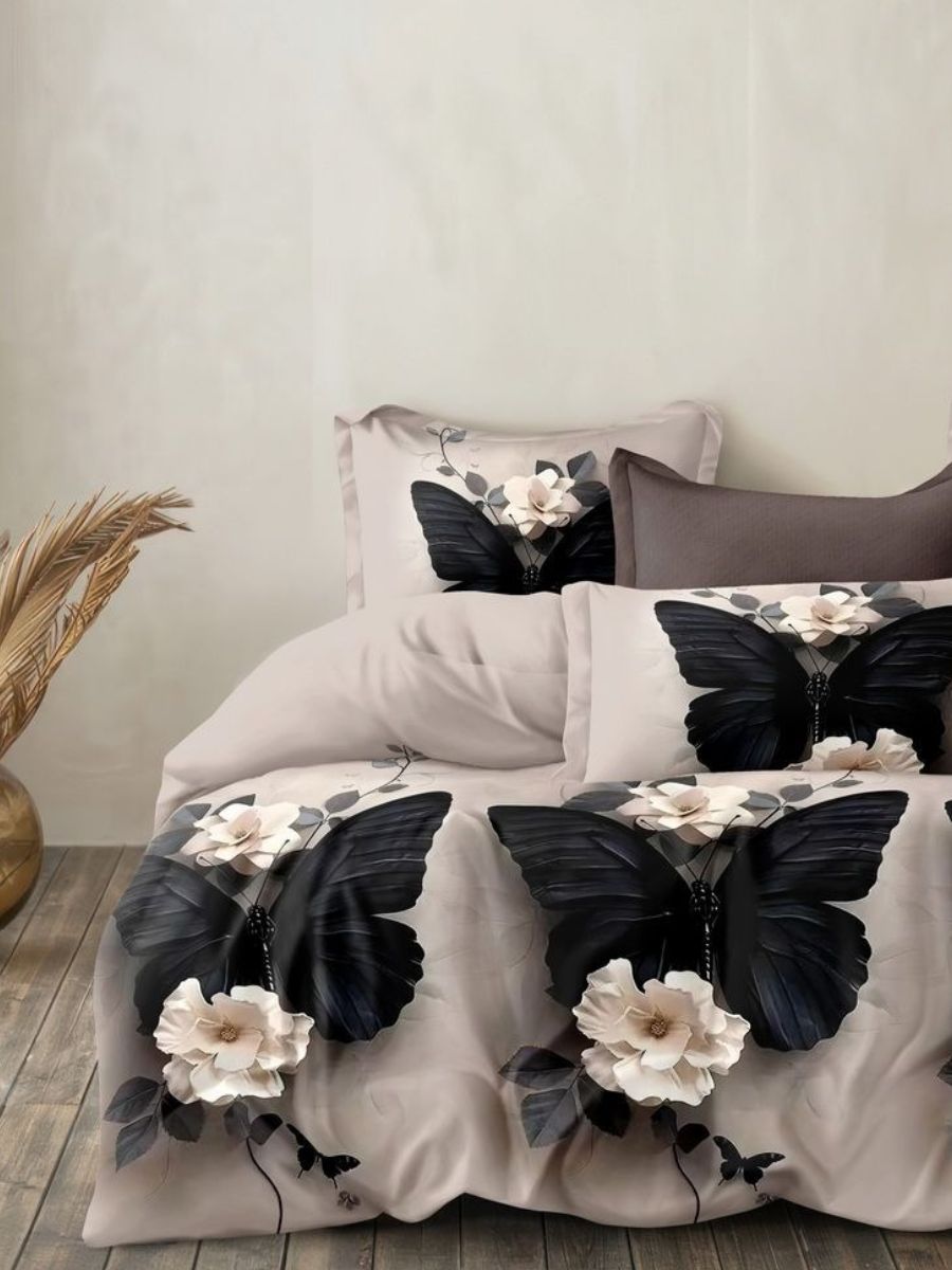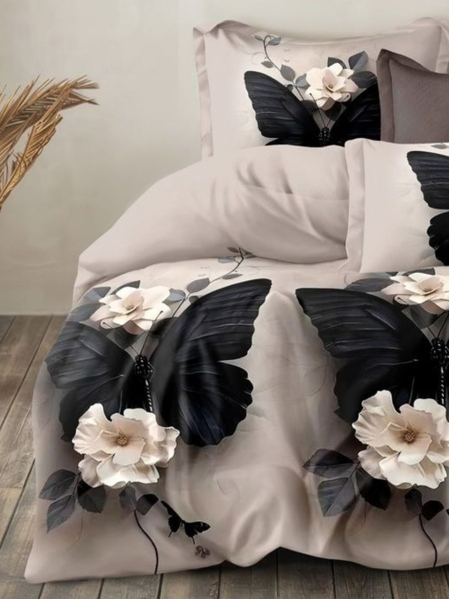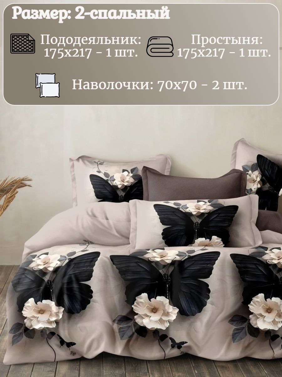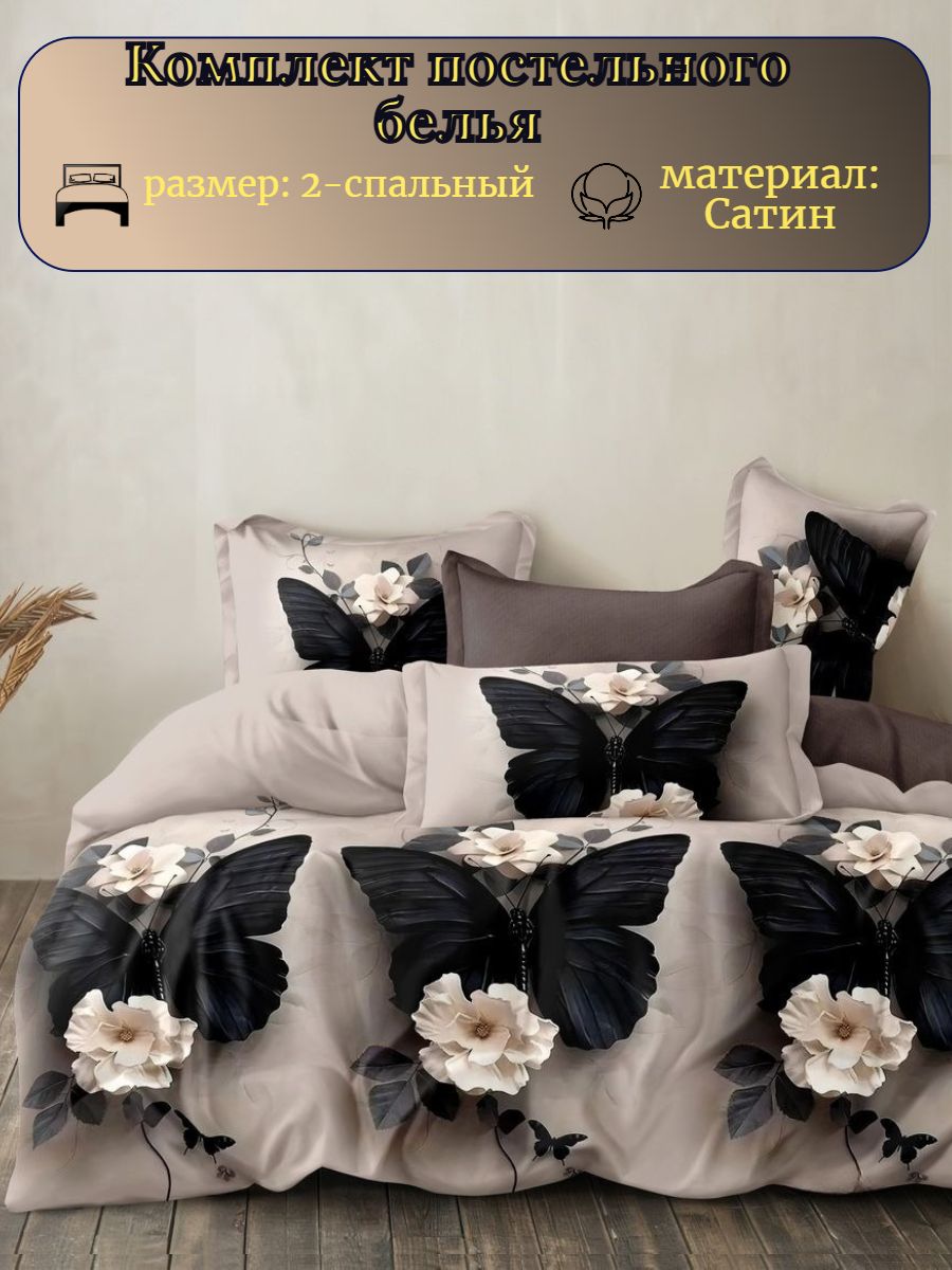 Двуспальное постельное бельё с принтом темных бабочек выполнена из сатина - натуральной ткани повышенной плотности и прочности. По сравнению с тканями полотняного переплетения сатин, благодаря атласному переплетению нитей, имеет благородный блеск, гладкость и визуально выглядит лучше. Комплектация изделия: пододеяльник на молнии 175х218 см-1шт, простыня (обычная) 175х218 см-1шт, наволочки на молнии 70х70 см-2шт., плотность ткани 115г/м2.