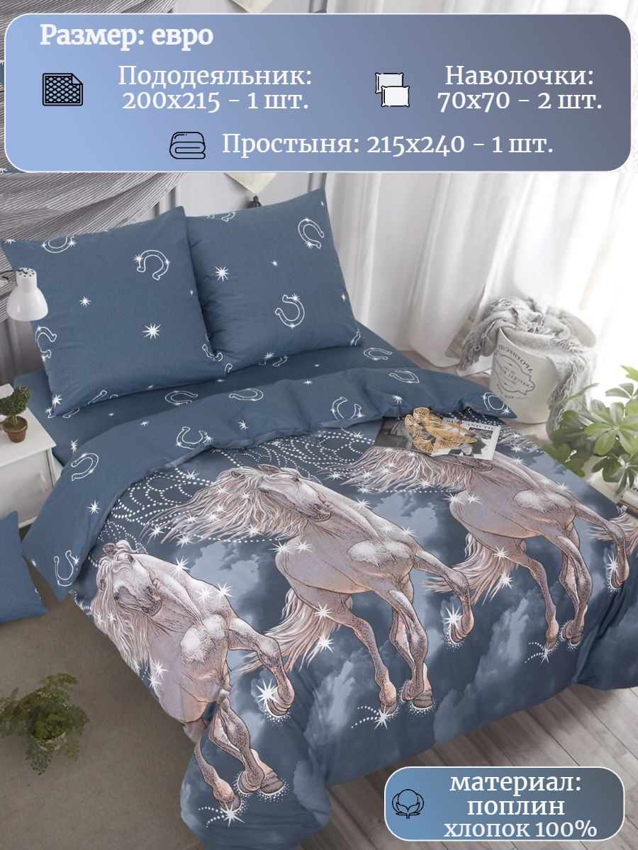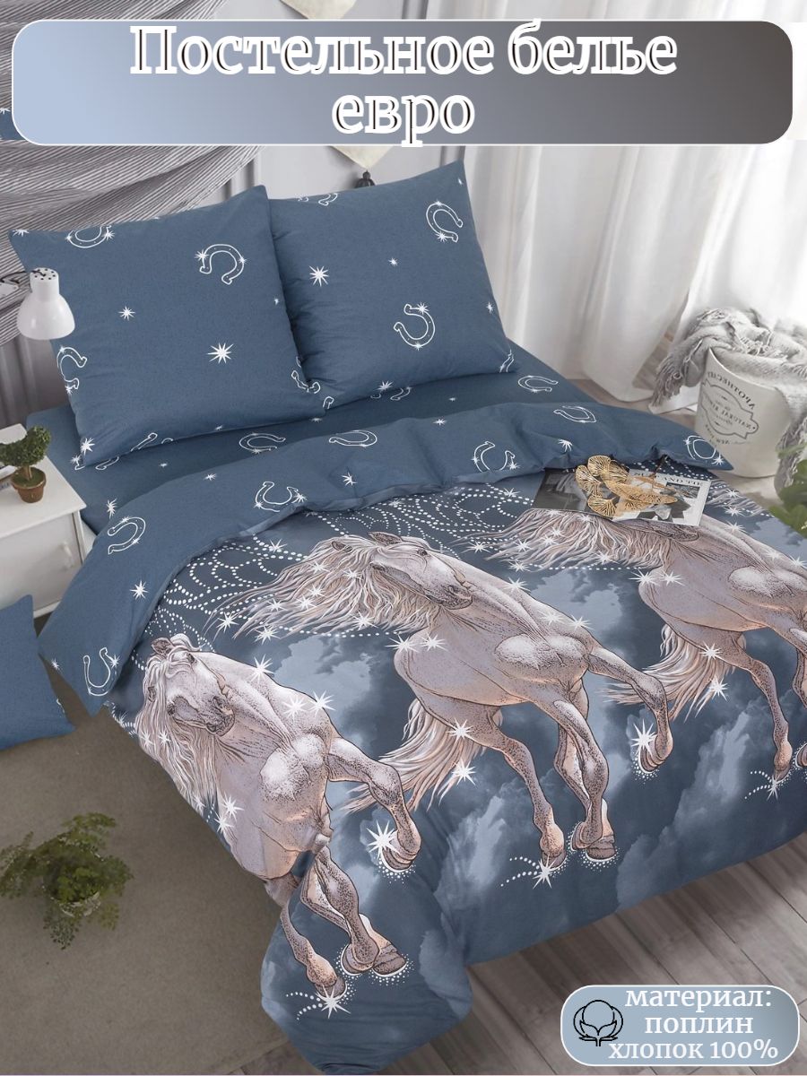 Новогодний комплект постельного белья из поплина плотностью 110±5 гр./кв.м. Постельное белье евро размера с динамичным принтом белоснежного пегаса, летящего сквозь облака подарит нежность и отличное настроение, принесет уют, тепло и покой в ваш дом. Комплект состоит из 1 пододеяльника 200х215, 1 простыни 215х240 и 2-х наволочек 70х70.