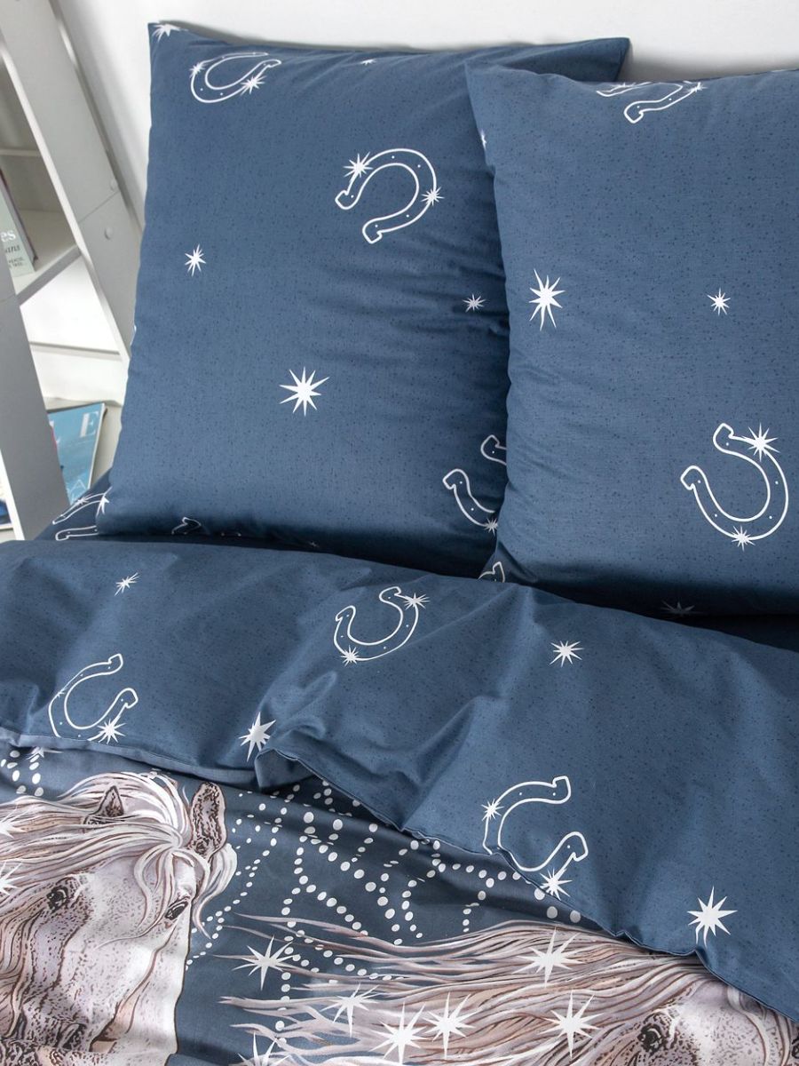 Новогодний комплект постельного белья из поплина плотностью 110±5 гр./кв.м. Семейное постельное белье с динамичным принтом белоснежного пегаса, летящего сквозь облака подарит комфорт и отличное настроение, принесет уют, тепло и покой в ваш дом. Комплект состоит из 2-х пододеяльников 145х215, 1 простыни 215х240 и 2-х наволочек 70х70.