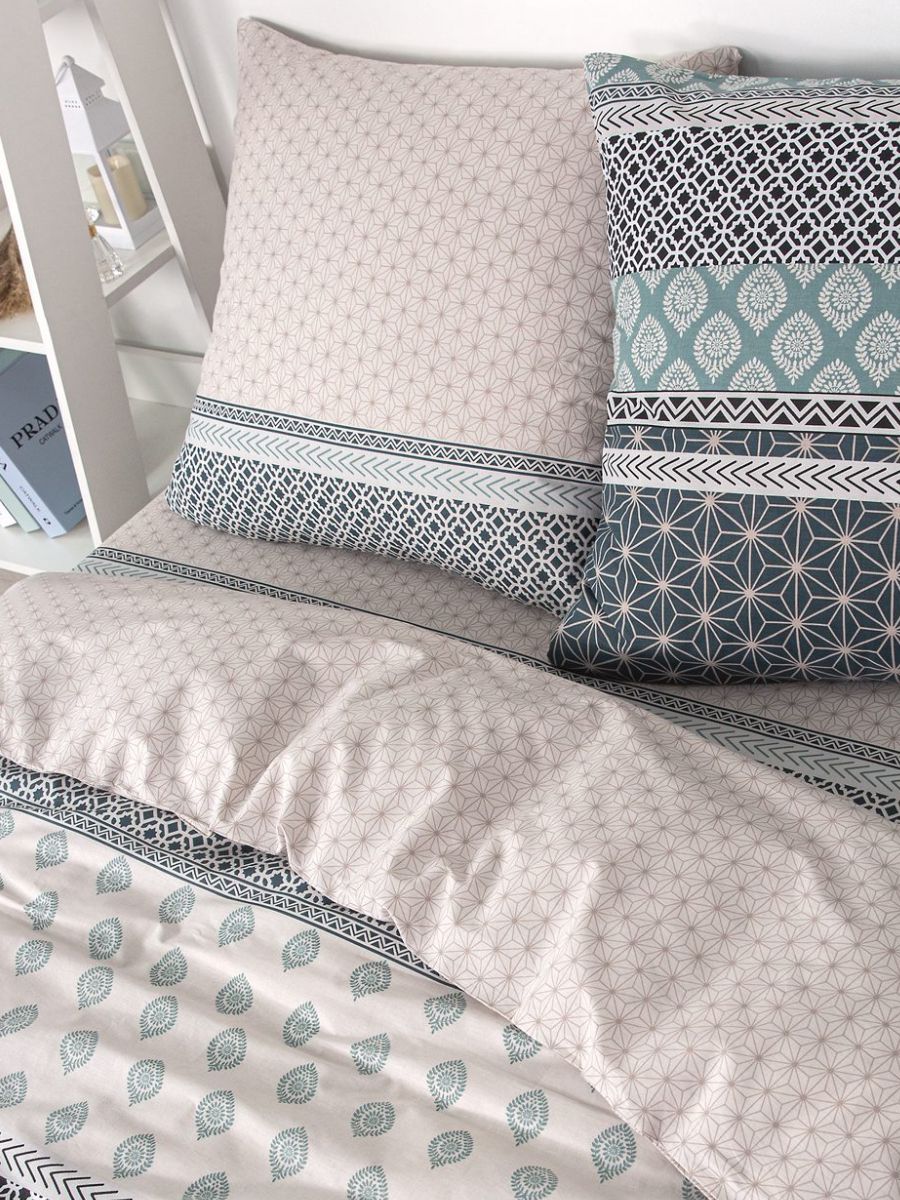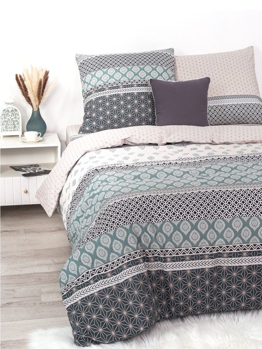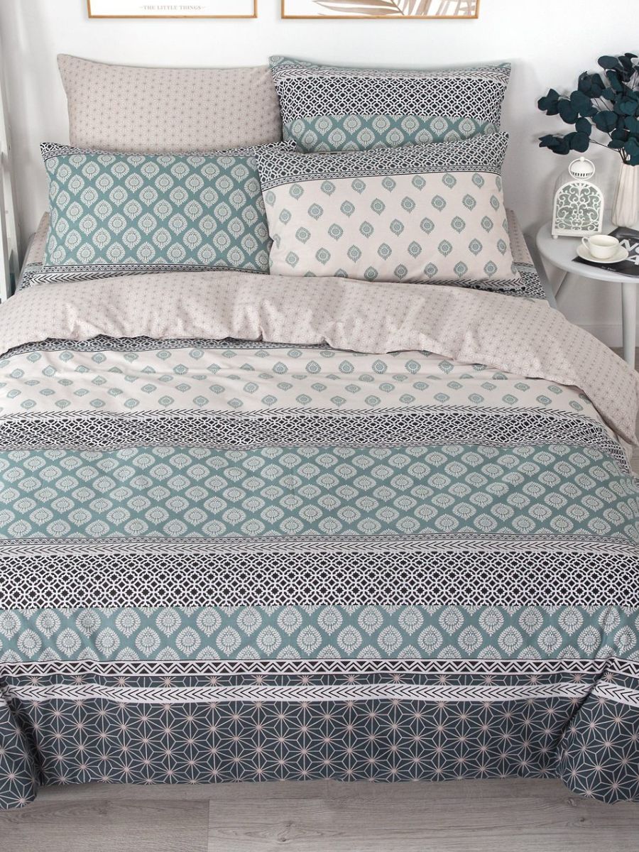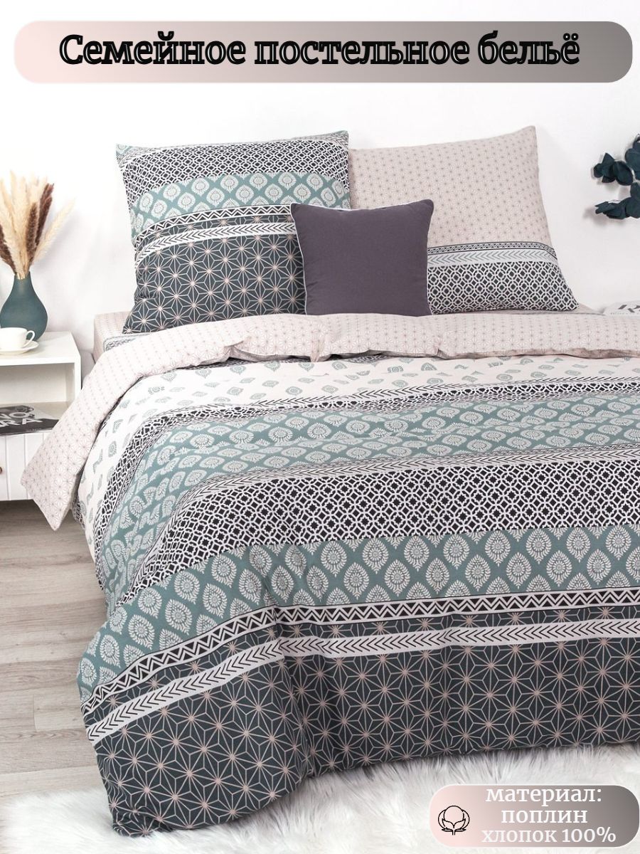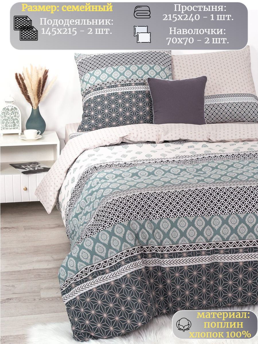 Нежный комплект постельного белья из поплина плотностью 110±5 гр./кв.м. Семейное постельное белье с геометрическим орнаментом подарит комфорт и отличное настроение, принесет уют, тепло и покой в ваш дом. Комплект состоит из 2-х пододеяльников 145х215, 1 простыни 215х240 и 2-х наволочек 70х70.
