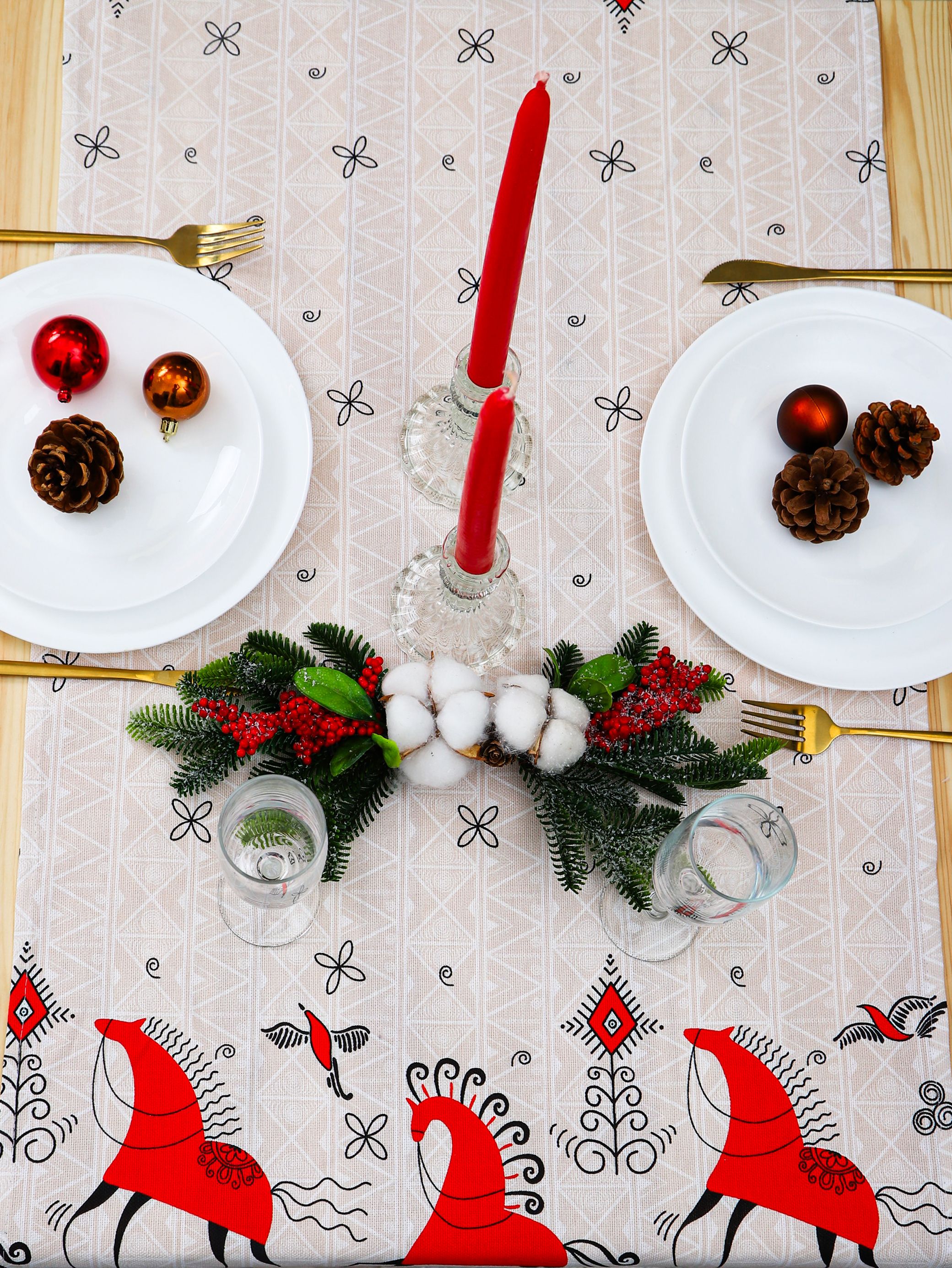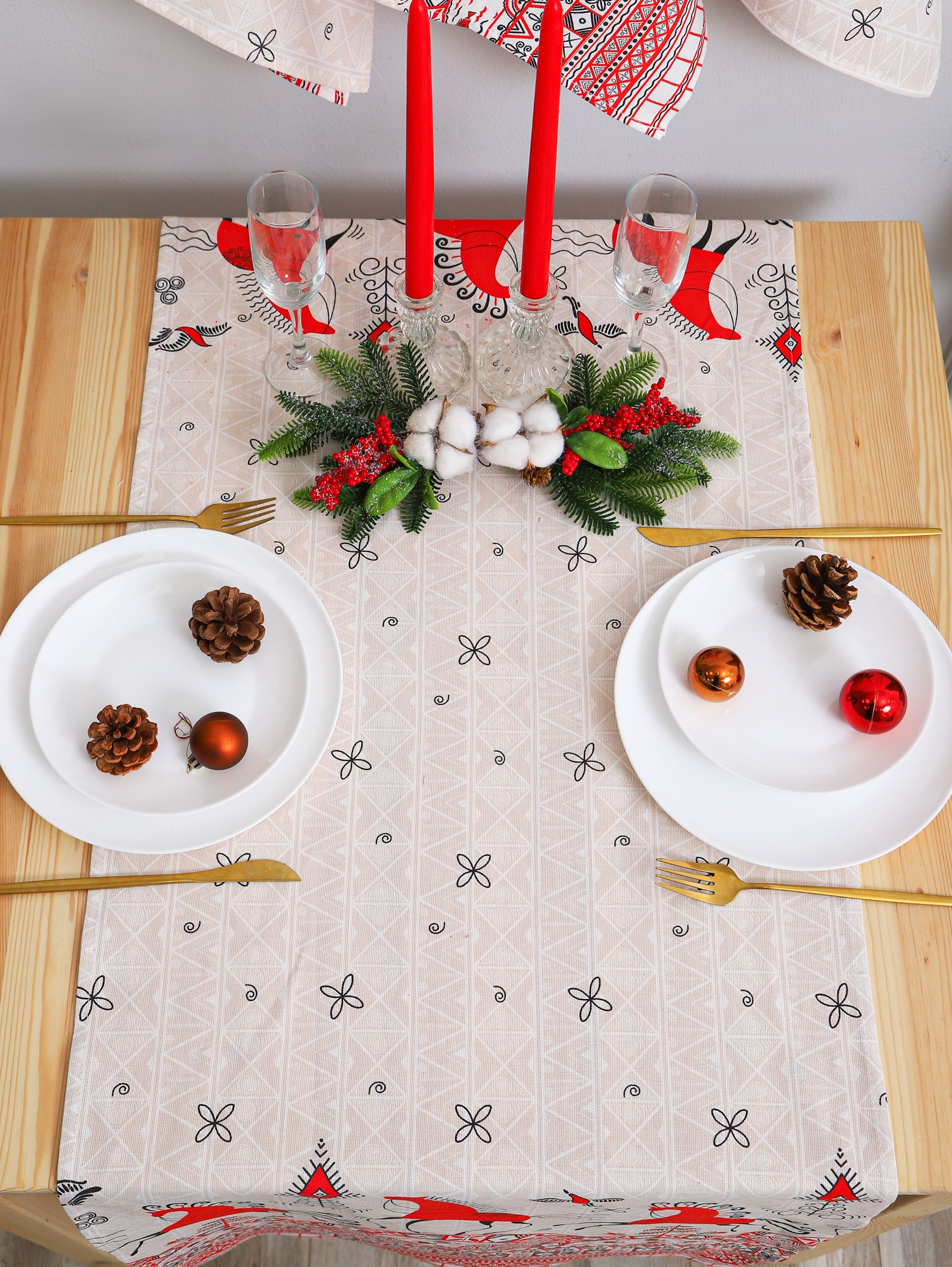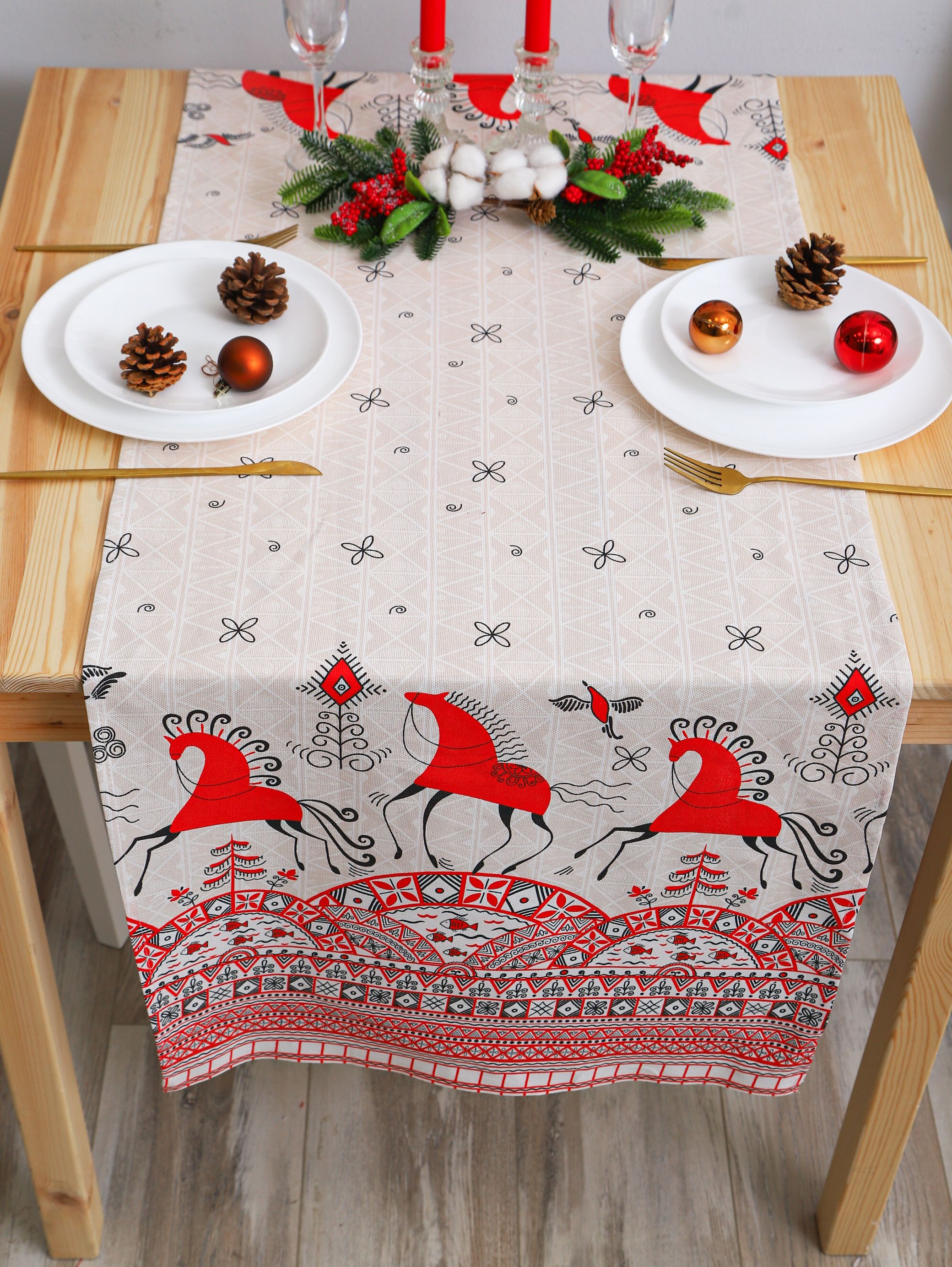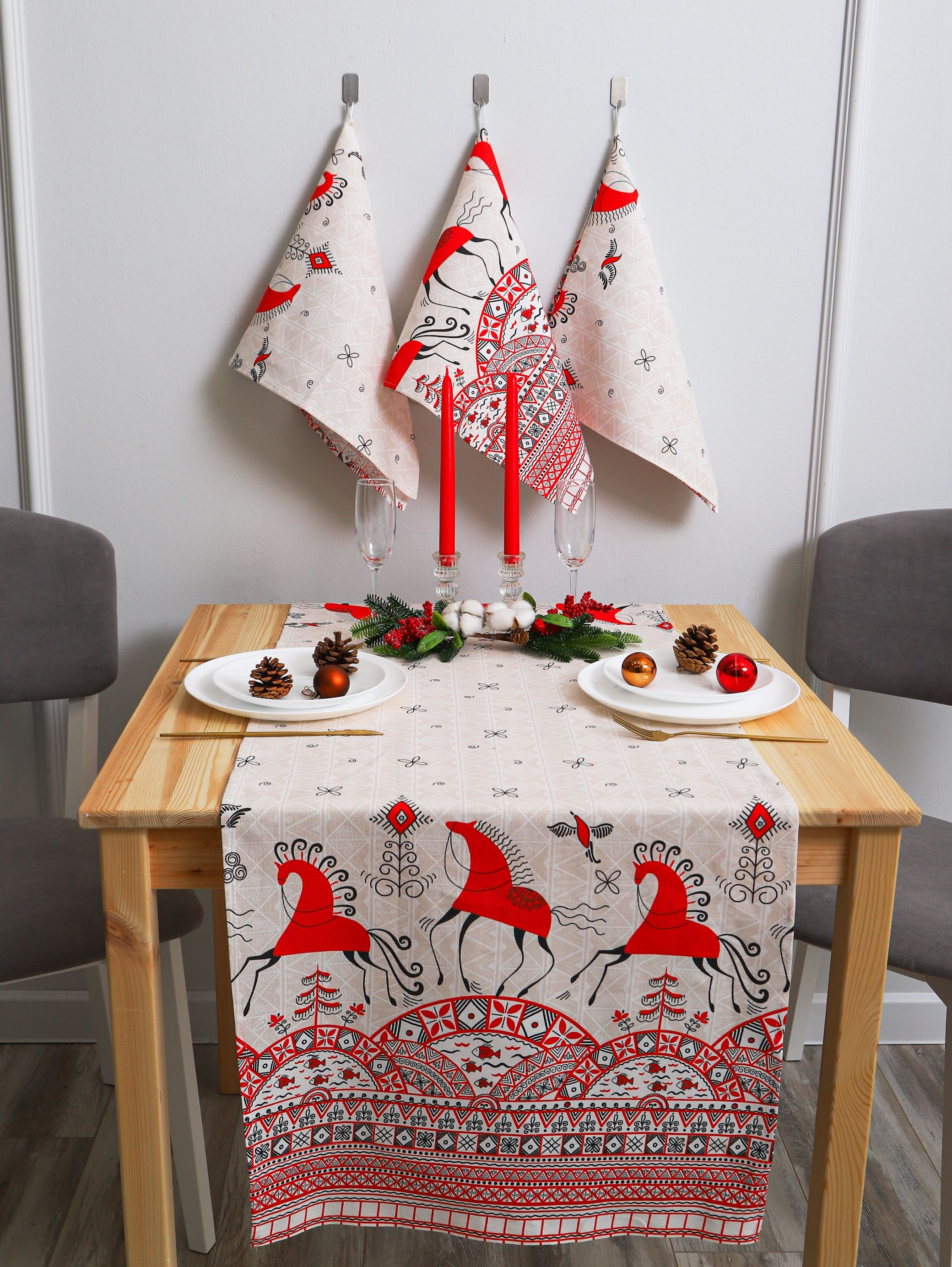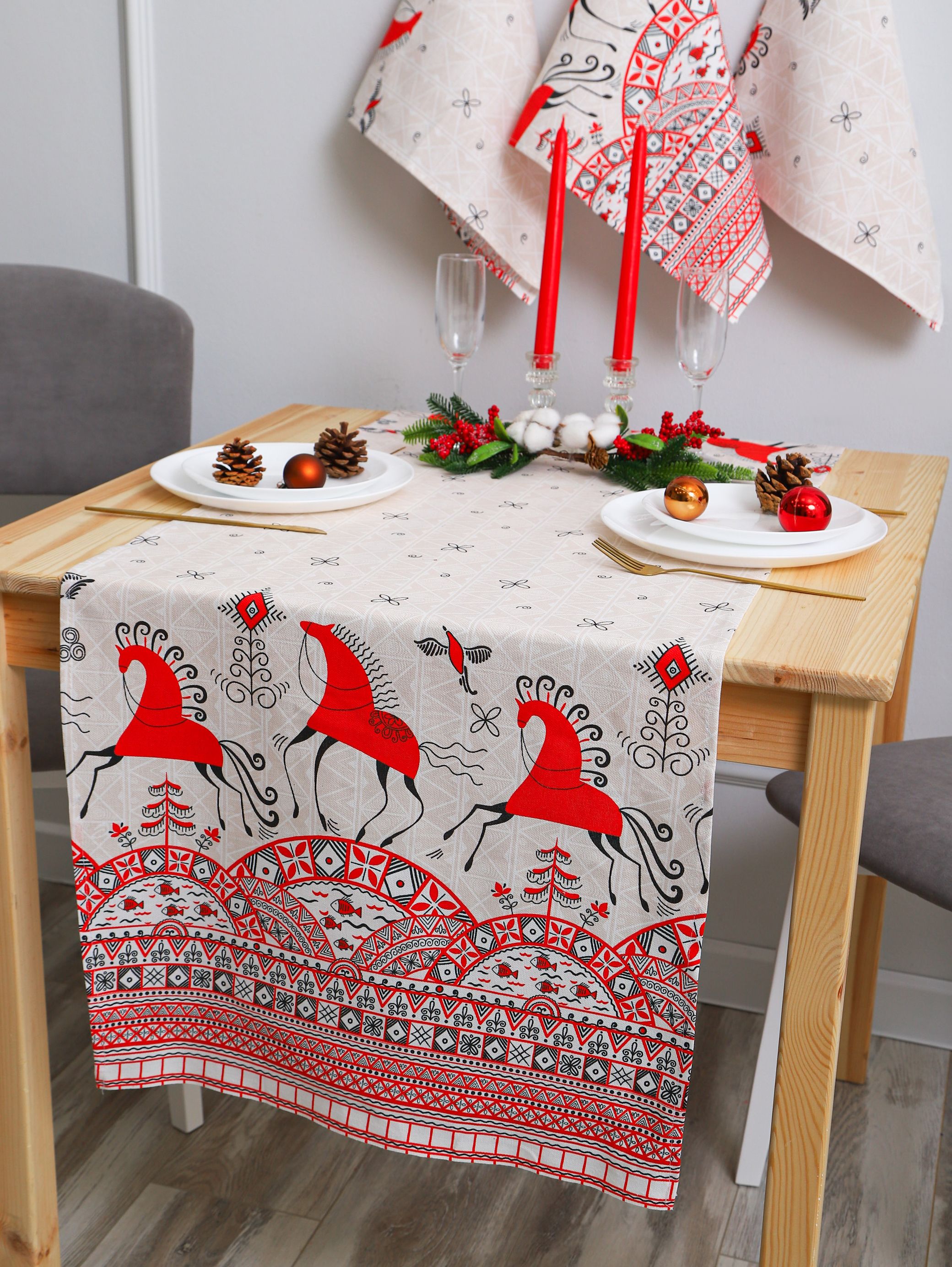 Рушник с ярким орнаментом красных коней и птиц (мезенская роспись) подходит для свадьбы под каравай, на венчание. Изображение красной лошади на рушнике – символ 2026 года.